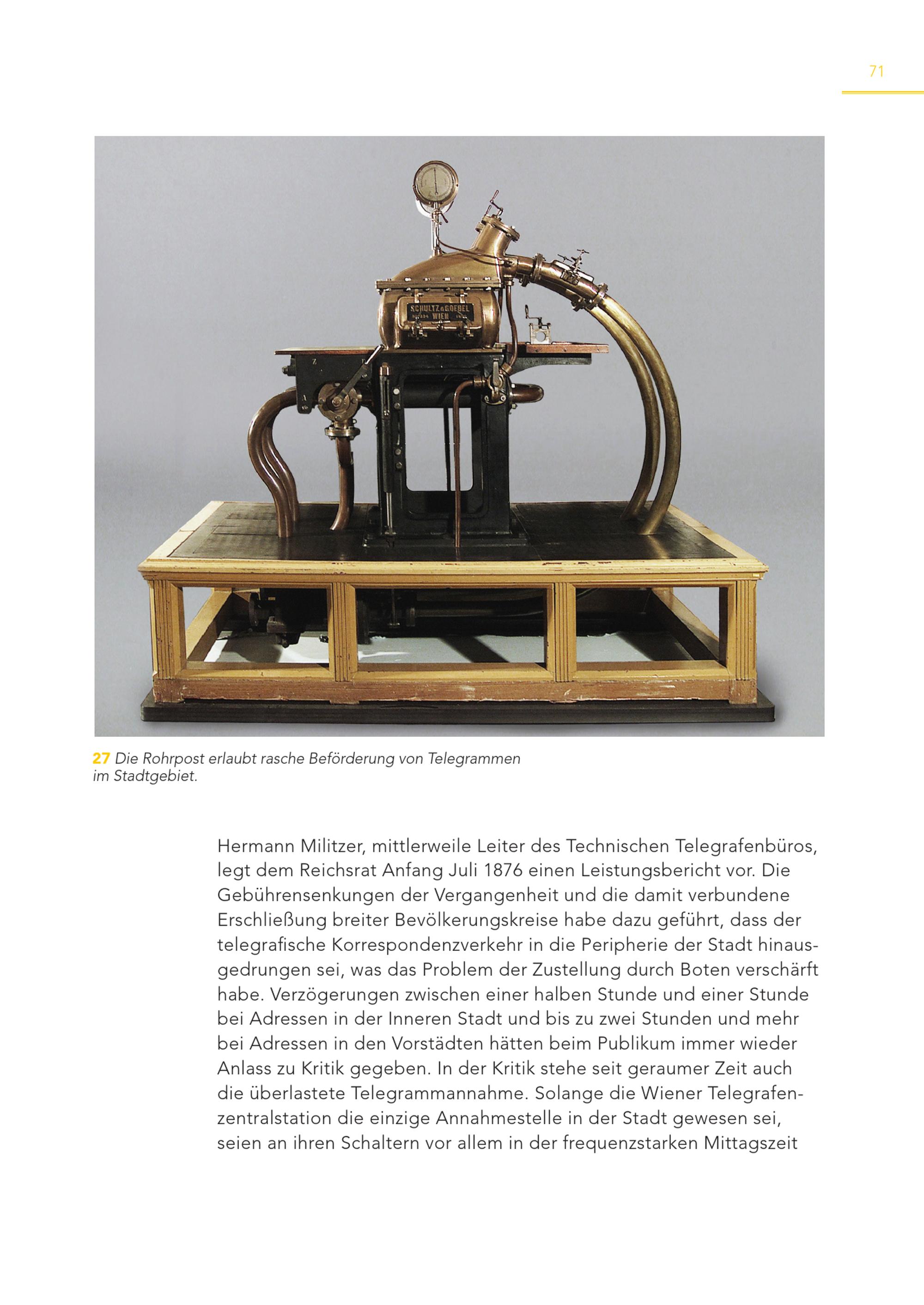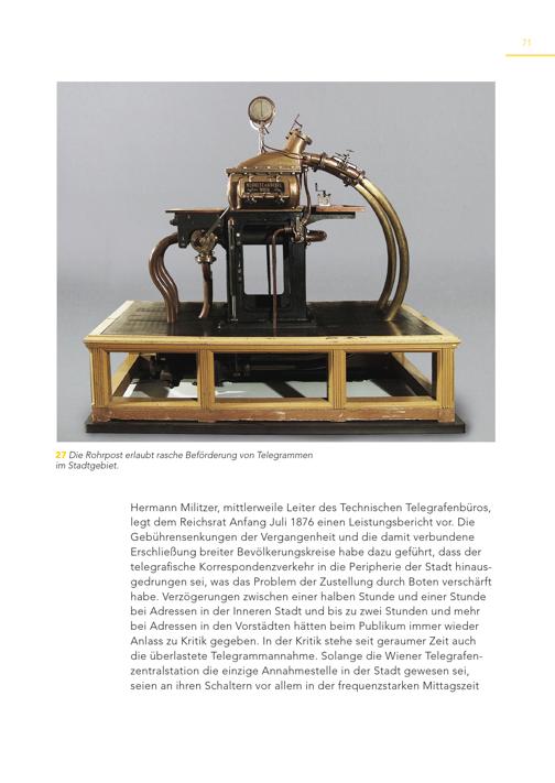 71 27 Die Rohrpost erlaubt rasche Beförderung von Telegrammen im Stadtgebiet. Hermann Militzer, mittlerweile Leiter des Technischen Telegrafenbüros, legt dem Reichsrat Anfang Juli 1876 einen Leistungsbericht vor. Die Gebührensenkungen der Vergangenheit und die damit verbundene Erschließung breiter Bevölkerungskreise habe dazu geführt, dass der telegrafische Korrespondenzverkehr in die Peripherie der Stadt hinausgedrungen sei, was das Problem der Zustellung durch Boten verschärft habe. Verzögerungen zwischen einer halben Stunde und einer Stunde bei Adressen in der Inneren Stadt und bis zu zwei Stunden und mehr bei Adressen in den Vorstädten hätten beim Publikum immer wieder Anlass zu Kritik gegeben. In der Kritik stehe seit geraumer Zeit auch die überlastete Telegrammannahme. Solange die Wiener Telegrafenzentralstation die einzige Annahmestelle in der Stadt gewesen sei, seien an ihren Schaltern vor allem in der frequenzstarken Mittagszeit