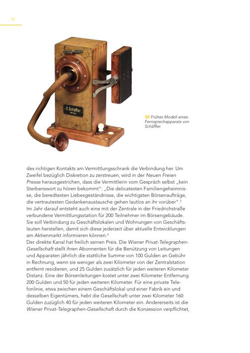 76 30 Frühes Modell eines Fernsprechapparats von Schäffler. des richtigen Kontakts am Vermittlungsschrank die Verbindung her. Um Zweifel bezüglich Diskretion zu zerstreuen, wird in der Neuen Freien Presse herausgestrichen, dass die Vermittlerin vom Gespräch selbst„kein Sterbenswort zu hören bekommt“:„Die delicatesten Familiengeheimnisse, die beredtesten Liebesgeständnisse, die wichtigsten Börsenaufträge, die vertrautesten Gedankenaustausche gehen lautlos an ihr vorüber“. 3 Im Jahr darauf entsteht auch eine mit der Zentrale in der Friedrichstraße verbundene Vermittlungsstation für 200 Teilnehmer im Börsengebäude. Sie soll Verbindung zu Geschäftslokalen und Wohnungen von Geschäftsleuten herstellen, damit sich diese jederzeit über aktuelle Entwicklungen am Aktienmarkt informieren können. 4 Der direkte Kanal hat freilich seinen Preis. Die Wiener Privat-TelegraphenGesellschaft stellt ihren Abonnenten für die Benützung von Leitungen und Apparaten jährlich die stattliche Summe von 100 Gulden an Gebühr in Rechnung, wenn sie weniger als zwei Kilometer von der Zentralstation entfernt residieren, und 25 Gulden zusätzlich für jeden weiteren Kilometer Distanz. Eine der Börsenleitungen kostet unter zwei Kilometer Entfernung 200 Gulden und 50 für jeden weiteren Kilometer. Für eine private Telefonlinie, etwa zwischen einem Geschäftslokal und einer Fabrik ein und desselben Eigentümers, hebt die Gesellschaft unter zwei Kilometer 160 Gulden zuzüglich 40 für jeden weiteren Kilometer ein. Andererseits ist die Wiener Privat-Telegraphen-Gesellschaft durch die Konzession verpflichtet,