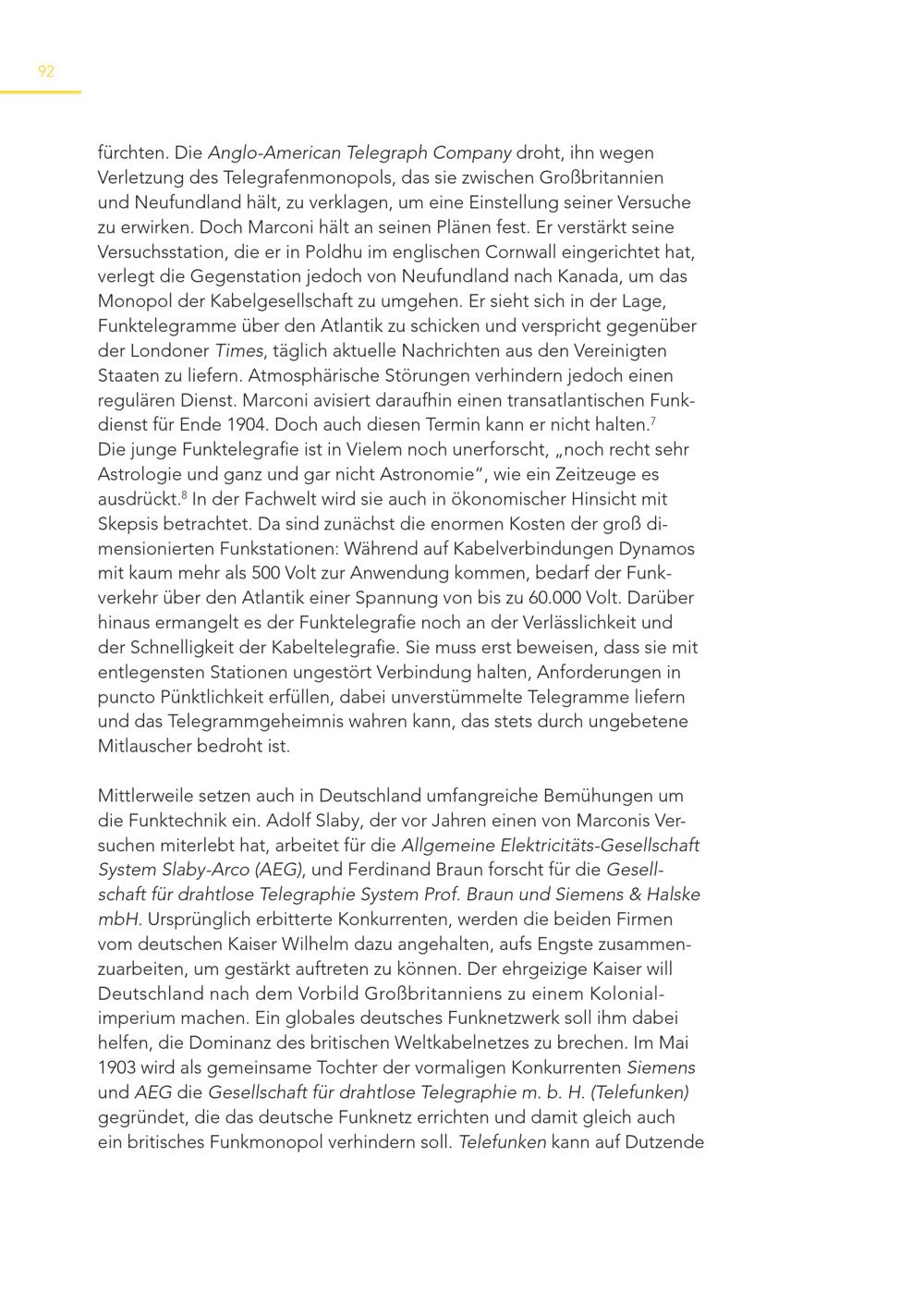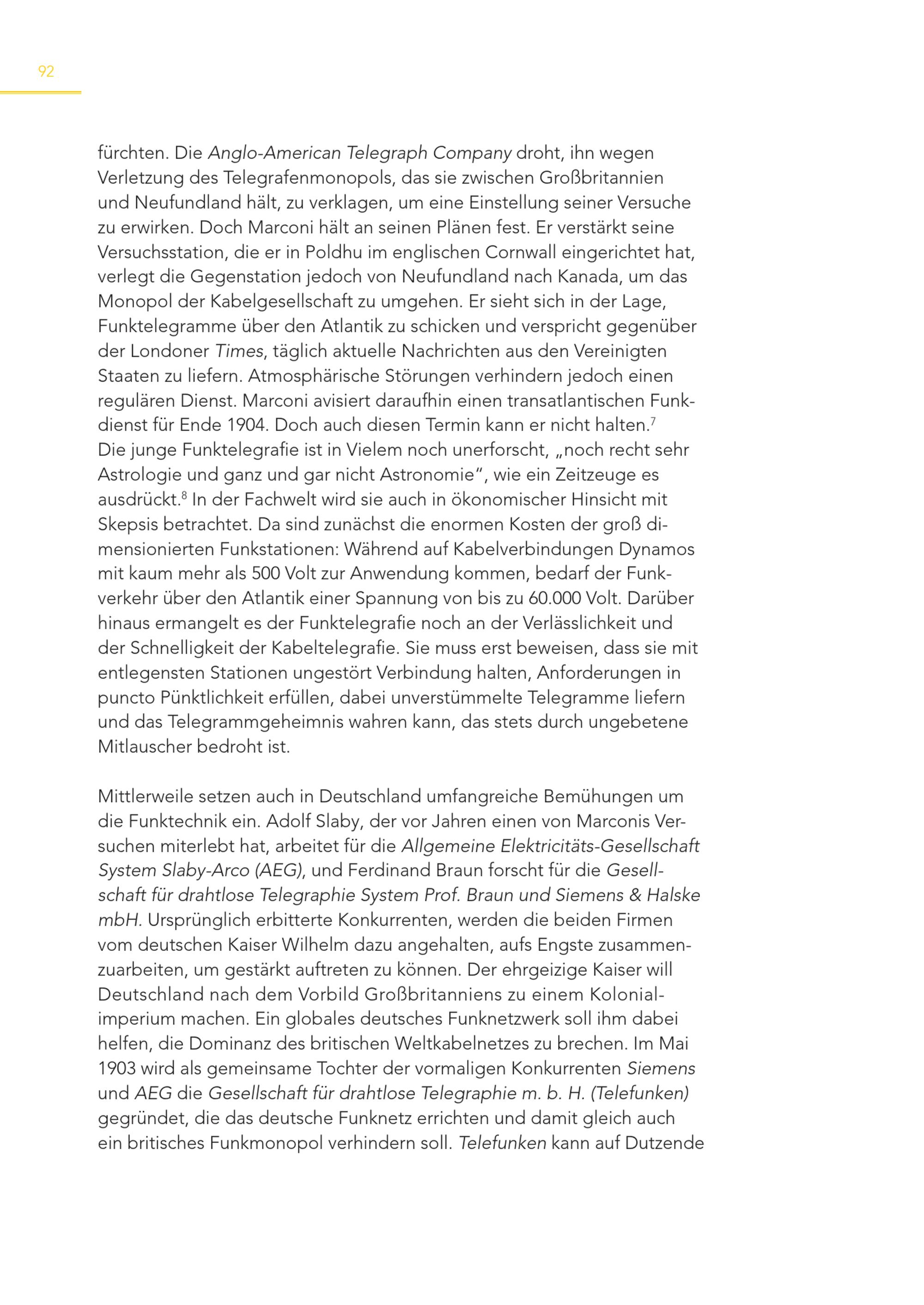 92 fürchten. Die Anglo-American Telegraph Company droht, ihn wegen Verletzung des Telegrafenmonopols, das sie zwischen Großbritannien und Neufundland hält, zu verklagen, um eine Einstellung seiner Versuche zu erwirken. Doch Marconi hält an seinen Plänen fest. Er verstärkt seine Versuchsstation, die er in Poldhu im englischen Cornwall eingerichtet hat, verlegt die Gegenstation jedoch von Neufundland nach Kanada, um das Monopol der Kabelgesellschaft zu umgehen. Er sieht sich in der Lage, Funktelegramme über den Atlantik zu schicken und verspricht gegenüber der Londoner Times , täglich aktuelle Nachrichten aus den Vereinigten Staaten zu liefern. Atmosphärische Störungen verhindern jedoch einen regulären Dienst. Marconi avisiert daraufhin einen transatlantischen Funkdienst für Ende 1904. Doch auch diesen Termin kann er nicht halten. 7 Die junge Funktelegrafie ist in Vielem noch unerforscht,„noch recht sehr Astrologie und ganz und gar nicht Astronomie“, wie ein Zeitzeuge es ausdrückt. 8 In der Fachwelt wird sie auch in ökonomischer Hinsicht mit Skepsis betrachtet. Da sind zunächst die enormen Kosten der groß dimensionierten Funkstationen: Während auf Kabelverbindungen Dynamos mit kaum mehr als 500 Volt zur Anwendung kommen, bedarf der Funkverkehr über den Atlantik einer Spannung von bis zu 60.000 Volt. Darüber hinaus ermangelt es der Funktelegrafie noch an der Verlässlichkeit und der Schnelligkeit der Kabeltelegrafie. Sie muss erst beweisen, dass sie mit entlegensten Stationen ungestört Verbindung halten, Anforderungen in puncto Pünktlichkeit erfüllen, dabei unverstümmelte Telegramme liefern und das Telegrammgeheimnis wahren kann, das stets durch ungebetene Mitlauscher bedroht ist. Mittlerweile setzen auch in Deutschland umfangreiche Bemühungen um die Funktechnik ein. Adolf Slaby, der vor Jahren einen von Marconis Versuchen miterlebt hat, arbeitet für die Allgemeine Elektricitäts-Gesellschaft System Slaby-Arco(AEG) , und Ferdinand Braun forscht für die Gesellschaft für drahtlose Telegraphie System Prof. Braun und Siemens& Halske mbH. Ursprünglich erbitterte Konkurrenten, werden die beiden Firmen vom deutschen Kaiser Wilhelm dazu angehalten, aufs Engste zusammenzuarbeiten, um gestärkt auftreten zu können. Der ehrgeizige Kaiser will Deutschland nach dem Vorbild Großbritanniens zu einem Kolonialimperium machen. Ein globales deutsches Funknetzwerk soll ihm dabei helfen, die Dominanz des britischen Weltkabelnetzes zu brechen. Im Mai 1903 wird als gemeinsame Tochter der vormaligen Konkurrenten Siemens und AEG die Gesellschaft für drahtlose Telegraphie m. b. H.(Telefunken) gegründet, die das deutsche Funknetz errichten und damit gleich auch ein britisches Funkmonopol verhindern soll. Telefunken kann auf Dutzende