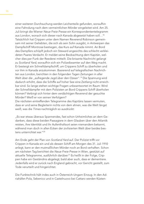 96 einer weiteren Durchsuchung werden Leichenteile gefunden, woraufhin eine Fahndung nach dem vermeintlichen Mörder eingeleitet wird. Am 25. Juli bringt die Wiener Neue Freie Presse ein Korrespondententelegramm aus London, wonach sich dieser nach Kanada abgesetzt haben soll… 18 Tatsächlich hat Crippen unter dem Namen Reverend Robinson gemeinsam mit seiner Geliebten, die sich als sein Sohn ausgibt, in Antwerpen das Dampfschiff Montrose bestiegen, das Kurs auf Kanada nimmt. An Bord des Dampfers schöpft jedoch ein Steward angesichts des schlecht verkleideten Paares Verdacht. Er meldet seine Beobachtung dem Kapitän, welcher dies per Funk der Reederei mitteilt. Die brisante Nachricht gelangt zu Scotland Yard , woraufhin sich ein Polizeibeamter auf den Weg macht. Er besteigt ein Schnelldampfschiff, um Crippens Schiff zu überholen und vor ihm in Kanada anzukommen. Basierend auf telegrafischen Nachrichten aus London, berichten in den folgenden Tagen Zeitungen in aller Welt über die„aufregende Jagd über den Ozean“. 19 Die Spannung wird dadurch erhöht, dass die Schiffe auf hoher See eine Zeitlang nicht erreichbar sind. So lange stehen wichtige Fragen unbeantwortet im Raum: Wird der Schnelldampfer mit dem Polizisten an Bord Crippens Schiff überholen können? Verbirgt sich hinter dem verdächtigen Reverend der gesuchte Mörder? Weiß er von seinen Verfolgern? Die nächsten eintreffenden Telegramme des Kapitäns lassen vermuten, dass er und seine Begleiterin nichts von dem ahnen, was die Welt längst weiß, was die Times nachträglich so ausdrückt: „Es war etwas überaus Spannendes, fast schon Unheimliches an dem Gedanken, dass diese beiden Passagiere in dem Glauben über den Atlantik reisten, ihre Identität und ihr Aufenthaltsort seien niemandem bekannt, während man doch in allen Ecken der zivilisierten Welt über beides bestens unterrichtet war.“ 20 Am Ende geht der Plan von Scotland Yard auf. Der Polizist trifft vor Crippen in Kanada ein und als dessen Schiff am Morgen des 31. Juli 1910 anlegt, kann er den mutmaßlichen Mörder noch an Bord verhaften. Schon am nächsten Tag berichtet die Neue Freie Presse in Wien, gestützt auf aktuelle Telegramme, ausführlich darüber. 21 Es heißt in der Folge, Crippen habe ein Geständnis abgelegt, bald aber auch, dass er dementiere. Jedenfalls wird er zurück nach England gebracht, vor Gericht gestellt, zum Tode verurteilt und hingerichtet. Die Funktechnik hält indes auch in Österreich-Ungarn Einzug. In den Adriahäfen Pola, Sebenico und in Castelnuovo bei Cattaro werden Küsten-