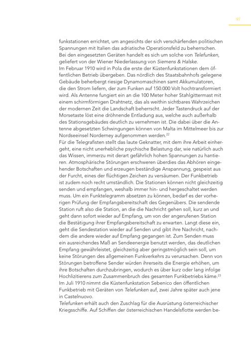97 funkstationen errichtet, um angesichts der sich verschärfenden politischen Spannungen mit Italien das adriatische Operationsfeld zu beherrschen. Bei den eingesetzten Geräten handelt es sich um solche von Telefunken , geliefert von der Wiener Niederlassung von Siemens& Halske . Im Februar 1910 wird in Pola die erste der Küstenfunkstationen dem öffentlichen Betrieb übergeben. Das nördlich des Staatsbahnhofs gelegene Gebäude beherbergt riesige Dynamomaschinen samt Akkumulatoren, die den Strom liefern, der zum Funken auf 150.000 Volt hochtransformiert wird. Als Antenne fungiert ein an die 100 Meter hoher Stahlgittermast mit einem schirmförmigen Drahtnetz, das als weithin sichtbares Wahrzeichen der modernen Zeit die Landschaft beherrscht. Jeder Tastendruck auf der Morsetaste löst eine dröhnende Entladung aus, welche auch außerhalb des Stationsgebäudes deutlich zu vernehmen ist. Die dabei über die Antenne abgesetzten Schwingungen können von Malta im Mittelmeer bis zur Nordseeinsel Norderney aufgenommen werden. 22 Für die Telegrafisten stellt das laute Geknatter, mit dem ihre Arbeit einhergeht, eine nicht unerhebliche psychische Belastung dar, wie natürlich auch das Wissen, immerzu mit derart gefährlich hohen Spannungen zu hantieren. Atmosphärische Störungen erschweren überdies das Abhören eingehender Botschaften und erzeugen beständige Anspannung, gespeist aus der Furcht, eines der flüchtigen Zeichen zu versäumen. Der Funkbetrieb ist zudem noch recht umständlich. Die Stationen können nicht gleichzeitig senden und empfangen, weshalb immer hin- und hergeschaltet werden muss. Um ein Funktelegramm absetzen zu können, bedarf es der vorherigen Prüfung der Empfangsbereitschaft des Gegenübers. Die sendende Station ruft also die Station, an die die Nachricht gehen soll, kurz an und geht dann sofort wieder auf Empfang, um von der angerufenen Station die Bestätigung ihrer Empfangsbereitschaft zu erwarten. Langt diese ein, geht die Sendestation wieder auf Senden und gibt ihre Nachricht, nachdem die andere wieder auf Empfang gegangen ist. Zum Senden muss ein ausreichendes Maß an Sendeenergie benutzt werden, das deutlichen Empfang gewährleistet, gleichzeitig aber geringstmöglich sein soll, um keine Störungen des allgemeinen Funkverkehrs zu verursachen. Denn von Störungen betroffene Sender würden ihrerseits die Energie erhöhen, um ihre Botschaften durchzubringen, wodurch es über kurz oder lang infolge Hochlizitierens zum Zusammenbruch des gesamten Funkbetriebs käme. 23 Im Juli 1910 nimmt die Küstenfunkstation Sebenico den öffentlichen Funkbetrieb mit Geräten von Telefunken auf, zwei Jahre später auch jene in Castelnuovo. Telefunken erhält auch den Zuschlag für die Ausrüstung österreichischer Kriegsschiffe. Auf Schiffen der österreichischen Handelsflotte werden be-