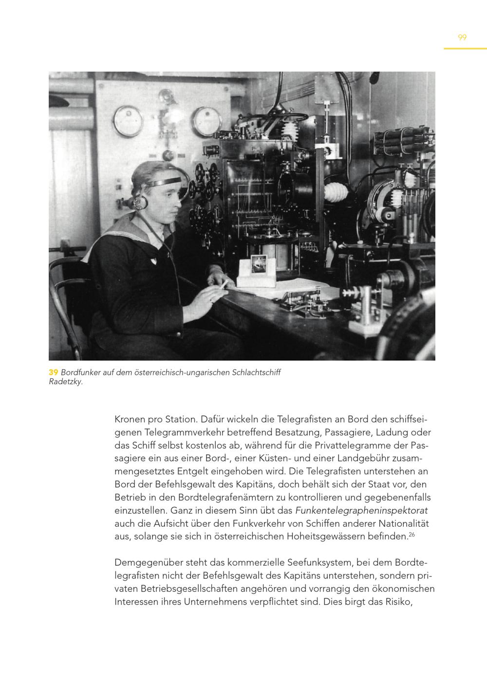 99 39 Bordfunker auf dem österreichisch-ungarischen Schlachtschiff Radetzky. Kronen pro Station. Dafür wickeln die Telegrafisten an Bord den schiffseigenen Telegrammverkehr betreffend Besatzung, Passagiere, Ladung oder das Schiff selbst kostenlos ab, während für die Privattelegramme der Passagiere ein aus einer Bord-, einer Küsten- und einer Landgebühr zusammengesetztes Entgelt eingehoben wird. Die Telegrafisten unterstehen an Bord der Befehlsgewalt des Kapitäns, doch behält sich der Staat vor, den Betrieb in den Bordtelegrafenämtern zu kontrollieren und gegebenenfalls einzustellen. Ganz in diesem Sinn übt das Funkentelegrapheninspektorat auch die Aufsicht über den Funkverkehr von Schiffen anderer Nationalität aus, solange sie sich in österreichischen Hoheitsgewässern befinden. 26 Demgegenüber steht das kommerzielle Seefunksystem, bei dem Bordtelegrafisten nicht der Befehlsgewalt des Kapitäns unterstehen, sondern privaten Betriebsgesellschaften angehören und vorrangig den ökonomischen Interessen ihres Unternehmens verpflichtet sind. Dies birgt das Risiko,