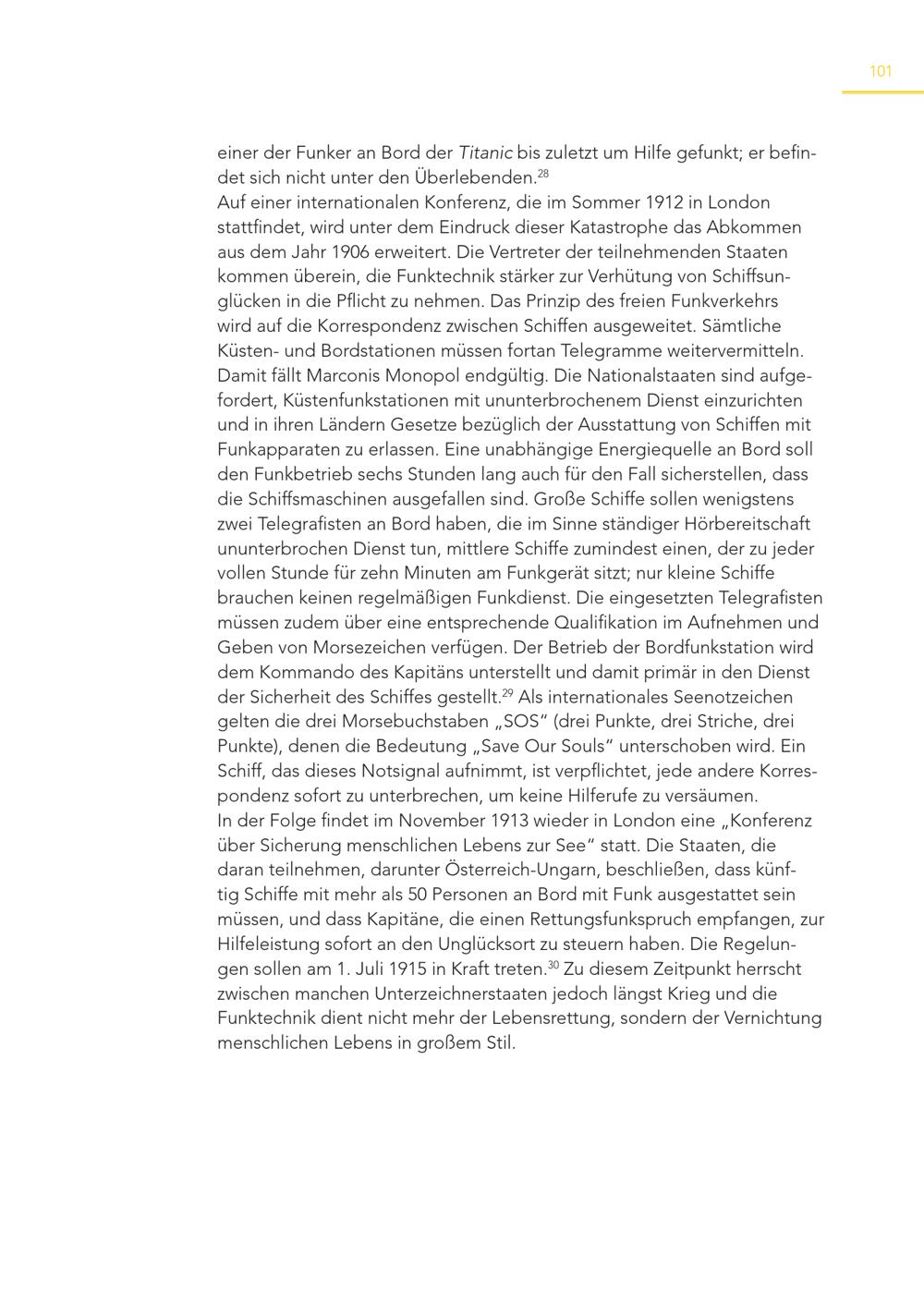 101 einer der Funker an Bord der Titanic bis zuletzt um Hilfe gefunkt; er befindet sich nicht unter den Überlebenden. 28 Auf einer internationalen Konferenz, die im Sommer 1912 in London stattfindet, wird unter dem Eindruck dieser Katastrophe das Abkommen aus dem Jahr 1906 erweitert. Die Vertreter der teilnehmenden Staaten kommen überein, die Funktechnik stärker zur Verhütung von Schiffsunglücken in die Pflicht zu nehmen. Das Prinzip des freien Funkverkehrs wird auf die Korrespondenz zwischen Schiffen ausgeweitet. Sämtliche Küsten- und Bordstationen müssen fortan Telegramme weitervermitteln. Damit fällt Marconis Monopol endgültig. Die Nationalstaaten sind aufgefordert, Küstenfunkstationen mit ununterbrochenem Dienst einzurichten und in ihren Ländern Gesetze bezüglich der Ausstattung von Schiffen mit Funkapparaten zu erlassen. Eine unabhängige Energiequelle an Bord soll den Funkbetrieb sechs Stunden lang auch für den Fall sicherstellen, dass die Schiffsmaschinen ausgefallen sind. Große Schiffe sollen wenigstens zwei Telegrafisten an Bord haben, die im Sinne ständiger Hörbereitschaft ununterbrochen Dienst tun, mittlere Schiffe zumindest einen, der zu jeder vollen Stunde für zehn Minuten am Funkgerät sitzt; nur kleine Schiffe brauchen keinen regelmäßigen Funkdienst. Die eingesetzten Telegrafisten müssen zudem über eine entsprechende Qualifikation im Aufnehmen und Geben von Morsezeichen verfügen. Der Betrieb der Bordfunkstation wird dem Kommando des Kapitäns unterstellt und damit primär in den Dienst der Sicherheit des Schiffes gestellt. 29 Als internationales Seenotzeichen gelten die drei Morsebuchstaben„SOS“(drei Punkte, drei Striche, drei Punkte), denen die Bedeutung„Save Our Souls“ unterschoben wird. Ein Schiff, das dieses Notsignal aufnimmt, ist verpflichtet, jede andere Korrespondenz sofort zu unterbrechen, um keine Hilferufe zu versäumen. In der Folge findet im November 1913 wieder in London eine„Konferenz über Sicherung menschlichen Lebens zur See“ statt. Die Staaten, die daran teilnehmen, darunter Österreich-Ungarn, beschließen, dass künftig Schiffe mit mehr als 50 Personen an Bord mit Funk ausgestattet sein müssen, und dass Kapitäne, die einen Rettungsfunkspruch empfangen, zur Hilfeleistung sofort an den Unglücksort zu steuern haben. Die Regelungen sollen am 1. Juli 1915 in Kraft treten. 30 Zu diesem Zeitpunkt herrscht zwischen manchen Unterzeichnerstaaten jedoch längst Krieg und die Funktechnik dient nicht mehr der Lebensrettung, sondern der Vernichtung menschlichen Lebens in großem Stil.