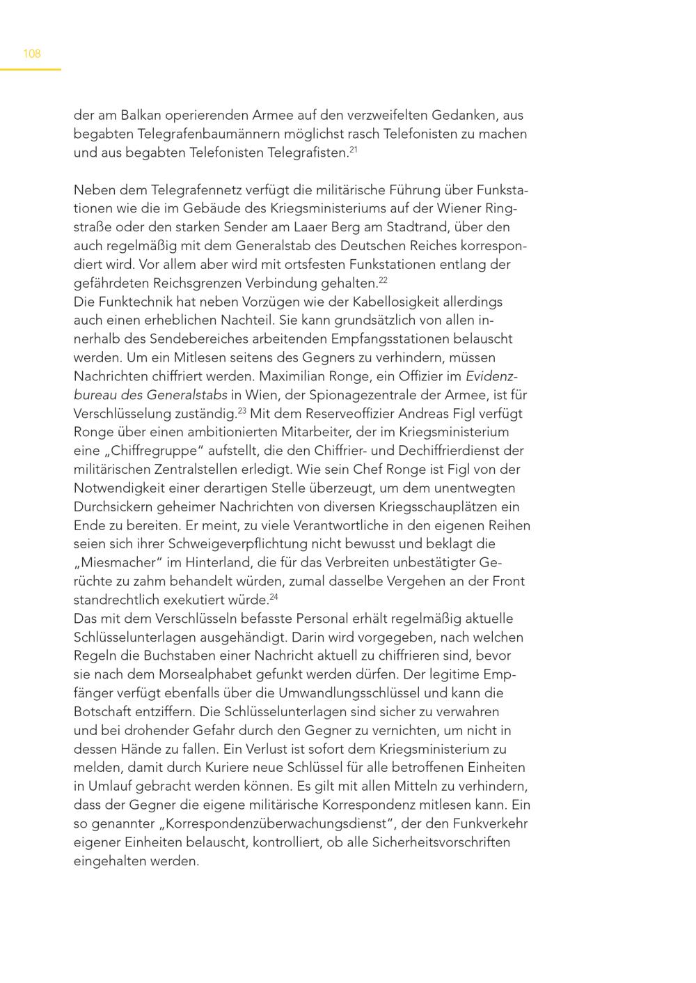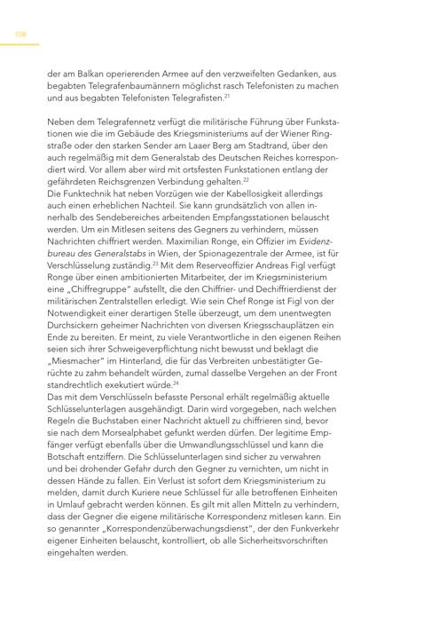 108 der am Balkan operierenden Armee auf den verzweifelten Gedanken, aus begabten Telegrafenbaumännern möglichst rasch Telefonisten zu machen und aus begabten Telefonisten Telegrafisten. 21 Neben dem Telegrafennetz verfügt die militärische Führung über Funkstationen wie die im Gebäude des Kriegsministeriums auf der Wiener Ringstraße oder den starken Sender am Laaer Berg am Stadtrand, über den auch regelmäßig mit dem Generalstab des Deutschen Reiches korrespondiert wird. Vor allem aber wird mit ortsfesten Funkstationen entlang der gefährdeten Reichsgrenzen Verbindung gehalten. 22 Die Funktechnik hat neben Vorzügen wie der Kabellosigkeit allerdings auch einen erheblichen Nachteil. Sie kann grundsätzlich von allen innerhalb des Sendebereiches arbeitenden Empfangsstationen belauscht werden. Um ein Mitlesen seitens des Gegners zu verhindern, müssen Nachrichten chiffriert werden. Maximilian Ronge, ein Offizier im Evidenzbureau des Generalstabs in Wien, der Spionagezentrale der Armee, ist für Verschlüsselung zuständig. 23 Mit dem Reserveoffizier Andreas Figl verfügt Ronge über einen ambitionierten Mitarbeiter, der im Kriegsministerium eine„Chiffregruppe“ aufstellt, die den Chiffrier- und Dechiffrierdienst der militärischen Zentralstellen erledigt. Wie sein Chef Ronge ist Figl von der Notwendigkeit einer derartigen Stelle überzeugt, um dem unentwegten Durchsickern geheimer Nachrichten von diversen Kriegsschauplätzen ein Ende zu bereiten. Er meint, zu viele Verantwortliche in den eigenen Reihen seien sich ihrer Schweigeverpflichtung nicht bewusst und beklagt die „Miesmacher“ im Hinterland, die für das Verbreiten unbestätigter Gerüchte zu zahm behandelt würden, zumal dasselbe Vergehen an der Front standrechtlich exekutiert würde. 24 Das mit dem Verschlüsseln befasste Personal erhält regelmäßig aktuelle Schlüsselunterlagen ausgehändigt. Darin wird vorgegeben, nach welchen Regeln die Buchstaben einer Nachricht aktuell zu chiffrieren sind, bevor sie nach dem Morsealphabet gefunkt werden dürfen. Der legitime Empfänger verfügt ebenfalls über die Umwandlungsschlüssel und kann die Botschaft entziffern. Die Schlüsselunterlagen sind sicher zu verwahren und bei drohender Gefahr durch den Gegner zu vernichten, um nicht in dessen Hände zu fallen. Ein Verlust ist sofort dem Kriegsministerium zu melden, damit durch Kuriere neue Schlüssel für alle betroffenen Einheiten in Umlauf gebracht werden können. Es gilt mit allen Mitteln zu verhindern, dass der Gegner die eigene militärische Korrespondenz mitlesen kann. Ein so genannter„Korrespondenzüberwachungsdienst“, der den Funkverkehr eigener Einheiten belauscht, kontrolliert, ob alle Sicherheitsvorschriften eingehalten werden.