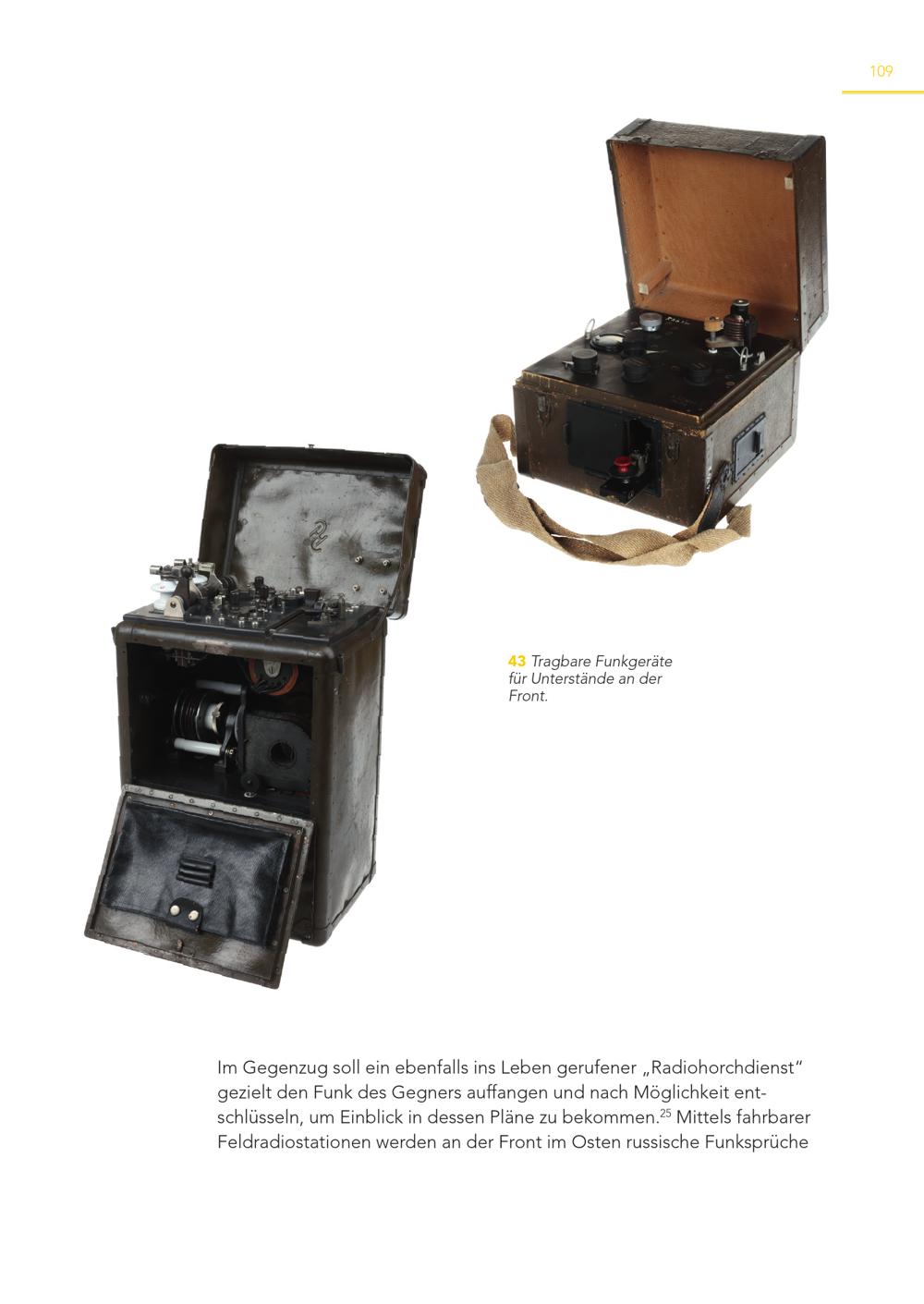 109 43 Tragbare Funkgeräte für Unterstände an der Front. Im Gegenzug soll ein ebenfalls ins Leben gerufener„Radiohorchdienst“ gezielt den Funk des Gegners auffangen und nach Möglichkeit entschlüsseln, um Einblick in dessen Pläne zu bekommen. 25 Mittels fahrbarer Feldradiostationen werden an der Front im Osten russische Funksprüche