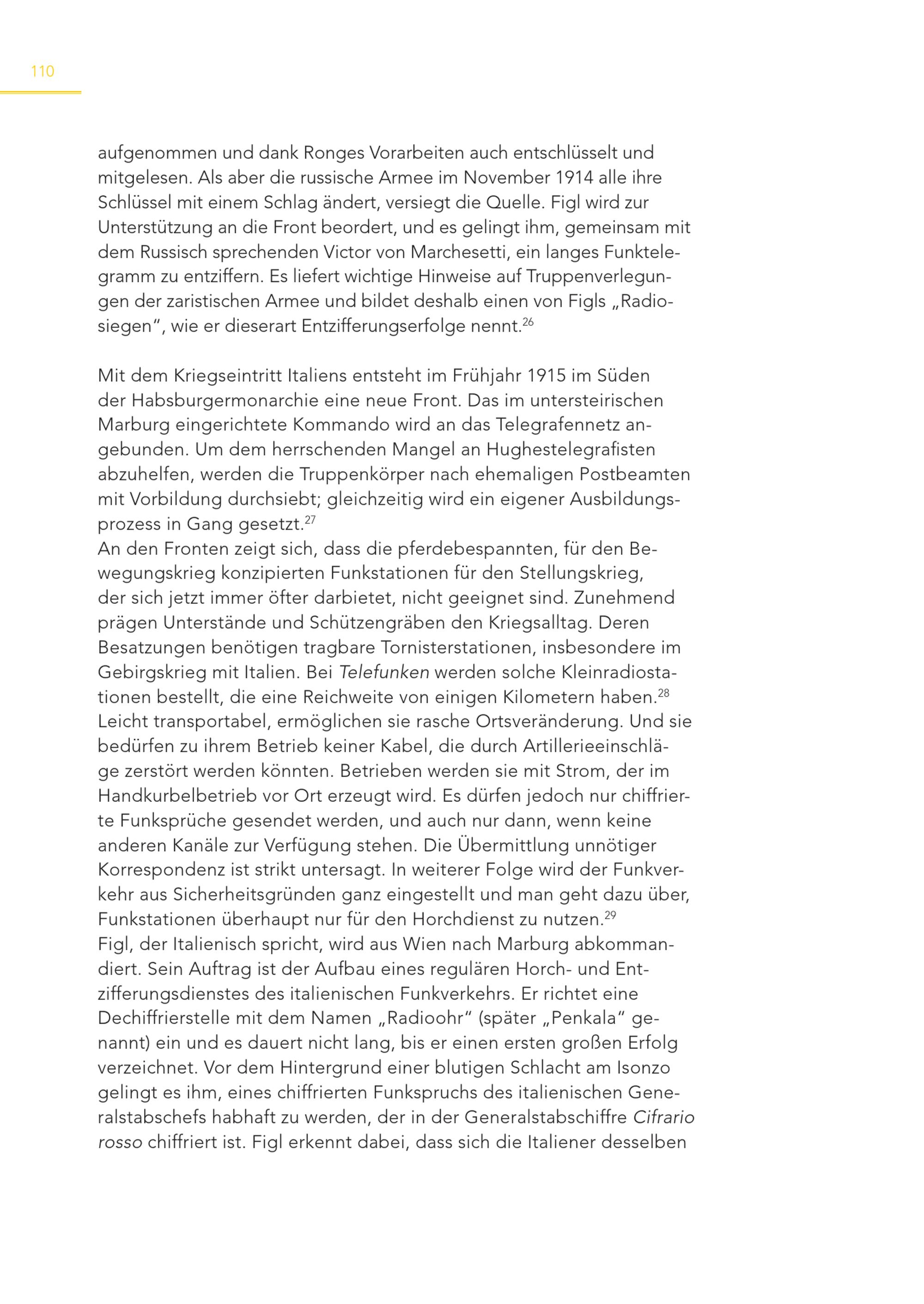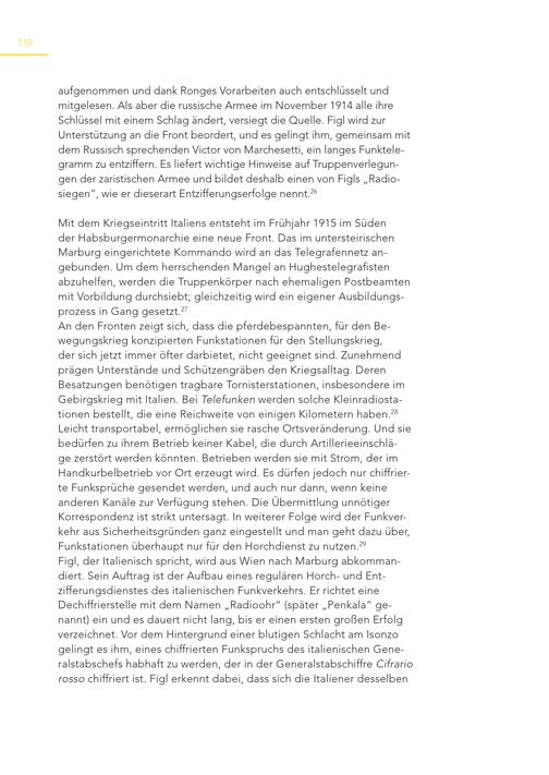 110 aufgenommen und dank Ronges Vorarbeiten auch entschlüsselt und mitgelesen. Als aber die russische Armee im November 1914 alle ihre Schlüssel mit einem Schlag ändert, versiegt die Quelle. Figl wird zur Unterstützung an die Front beordert, und es gelingt ihm, gemeinsam mit dem Russisch sprechenden Victor von Marchesetti, ein langes Funktelegramm zu entziffern. Es liefert wichtige Hinweise auf Truppenverlegungen der zaristischen Armee und bildet deshalb einen von Figls„Radiosiegen“, wie er dieserart Entzifferungserfolge nennt. 26 Mit dem Kriegseintritt Italiens entsteht im Frühjahr 1915 im Süden der Habsburgermonarchie eine neue Front. Das im untersteirischen Marburg eingerichtete Kommando wird an das Telegrafennetz angebunden. Um dem herrschenden Mangel an Hughestelegrafisten abzuhelfen, werden die Truppenkörper nach ehemaligen Postbeamten mit Vorbildung durchsiebt; gleichzeitig wird ein eigener Ausbildungsprozess in Gang gesetzt. 27 An den Fronten zeigt sich, dass die pferdebespannten, für den Bewegungskrieg konzipierten Funkstationen für den Stellungskrieg, der sich jetzt immer öfter darbietet, nicht geeignet sind. Zunehmend prägen Unterstände und Schützengräben den Kriegsalltag. Deren Besatzungen benötigen tragbare Tornisterstationen, insbesondere im Gebirgskrieg mit Italien. Bei Telefunken werden solche Kleinradiostationen bestellt, die eine Reichweite von einigen Kilometern haben. 28 Leicht transportabel, ermöglichen sie rasche Ortsveränderung. Und sie bedürfen zu ihrem Betrieb keiner Kabel, die durch Artillerieeinschläge zerstört werden könnten. Betrieben werden sie mit Strom, der im Handkurbelbetrieb vor Ort erzeugt wird. Es dürfen jedoch nur chiffrierte Funksprüche gesendet werden, und auch nur dann, wenn keine anderen Kanäle zur Verfügung stehen. Die Übermittlung unnötiger Korrespondenz ist strikt untersagt. In weiterer Folge wird der Funkverkehr aus Sicherheitsgründen ganz eingestellt und man geht dazu über, Funkstationen überhaupt nur für den Horchdienst zu nutzen. 29 Figl, der Italienisch spricht, wird aus Wien nach Marburg abkommandiert. Sein Auftrag ist der Aufbau eines regulären Horch- und Entzifferungsdienstes des italienischen Funkverkehrs. Er richtet eine Dechiffrierstelle mit dem Namen„Radioohr“(später„Penkala“ genannt) ein und es dauert nicht lang, bis er einen ersten großen Erfolg verzeichnet. Vor dem Hintergrund einer blutigen Schlacht am Isonzo gelingt es ihm, eines chiffrierten Funkspruchs des italienischen Generalstabschefs habhaft zu werden, der in der Generalstabschiffre Cifrario rosso chiffriert ist. Figl erkennt dabei, dass sich die Italiener desselben