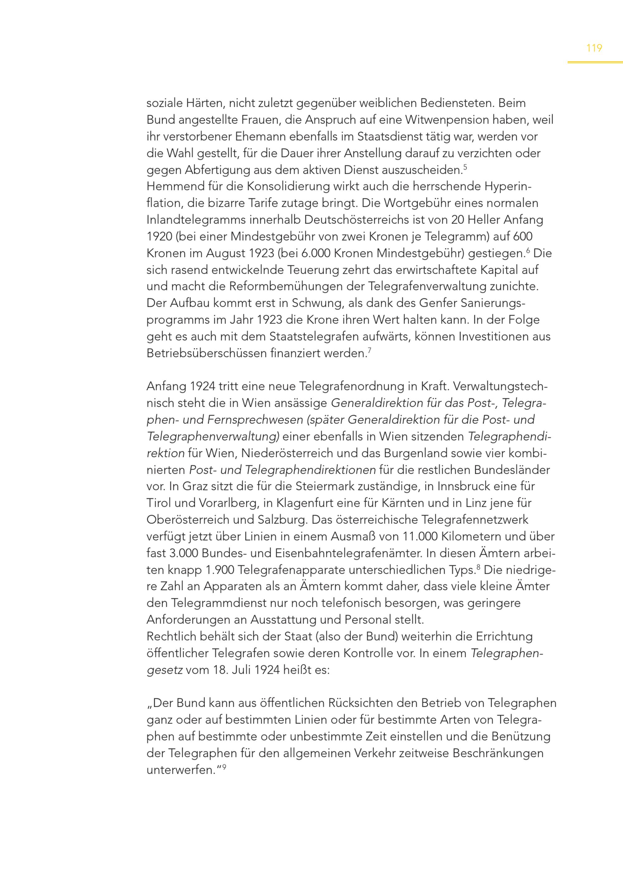 119 soziale Härten, nicht zuletzt gegenüber weiblichen Bediensteten. Beim Bund angestellte Frauen, die Anspruch auf eine Witwenpension haben, weil ihr verstorbener Ehemann ebenfalls im Staatsdienst tätig war, werden vor die Wahl gestellt, für die Dauer ihrer Anstellung darauf zu verzichten oder gegen Abfertigung aus dem aktiven Dienst auszuscheiden. 5 Hemmend für die Konsolidierung wirkt auch die herrschende Hyperinflation, die bizarre Tarife zutage bringt. Die Wortgebühr eines normalen Inlandtelegramms innerhalb Deutschösterreichs ist von 20 Heller Anfang 1920(bei einer Mindestgebühr von zwei Kronen je Telegramm) auf 600 Kronen im August 1923(bei 6.000 Kronen Mindestgebühr) gestiegen. 6 Die sich rasend entwickelnde Teuerung zehrt das erwirtschaftete Kapital auf und macht die Reformbemühungen der Telegrafenverwaltung zunichte. Der Aufbau kommt erst in Schwung, als dank des Genfer Sanierungsprogramms im Jahr 1923 die Krone ihren Wert halten kann. In der Folge geht es auch mit dem Staatstelegrafen aufwärts, können Investitionen aus Betriebsüberschüssen finanziert werden. 7 Anfang 1924 tritt eine neue Telegrafenordnung in Kraft. Verwaltungstechnisch steht die in Wien ansässige Generaldirektion für das Post-, Telegraphen- und Fernsprechwesen(später Generaldirektion für die Post- und Telegraphenverwaltung) einer ebenfalls in Wien sitzenden Telegraphendirektion für Wien, Niederösterreich und das Burgenland sowie vier kombinierten Post- und Telegraphendirektionen für die restlichen Bundesländer vor. In Graz sitzt die für die Steiermark zuständige, in Innsbruck eine für Tirol und Vorarlberg, in Klagenfurt eine für Kärnten und in Linz jene für Oberösterreich und Salzburg. Das österreichische Telegrafennetzwerk verfügt jetzt über Linien in einem Ausmaß von 11.000 Kilometern und über fast 3.000 Bundes- und Eisenbahntelegrafenämter. In diesen Ämtern arbeiten knapp 1.900 Telegrafenapparate unterschiedlichen Typs. 8 Die niedrigere Zahl an Apparaten als an Ämtern kommt daher, dass viele kleine Ämter den Telegrammdienst nur noch telefonisch besorgen, was geringere Anforderungen an Ausstattung und Personal stellt. Rechtlich behält sich der Staat(also der Bund) weiterhin die Errichtung öffentlicher Telegrafen sowie deren Kontrolle vor. In einem Telegraphengesetz vom 18. Juli 1924 heißt es: „Der Bund kann aus öffentlichen Rücksichten den Betrieb von Telegraphen ganz oder auf bestimmten Linien oder für bestimmte Arten von Telegraphen auf bestimmte oder unbestimmte Zeit einstellen und die Benützung der Telegraphen für den allgemeinen Verkehr zeitweise Beschränkungen unterwerfen.“ 9