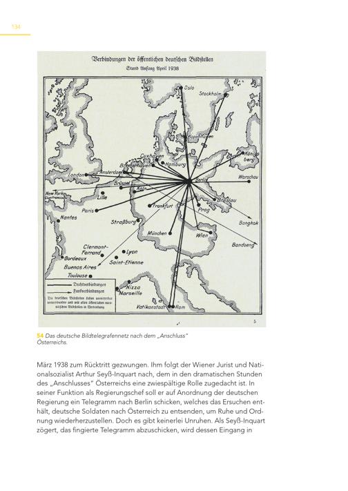 134 54 Das deutsche Bildtelegrafennetz nach dem„Anschluss“ Österreichs. März 1938 zum Rücktritt gezwungen. Ihm folgt der Wiener Jurist und Nationalsozialist Arthur Seyß-Inquart nach, dem in den dramatischen Stunden des„Anschlusses“ Österreichs eine zwiespältige Rolle zugedacht ist. In seiner Funktion als Regierungschef soll er auf Anordnung der deutschen Regierung ein Telegramm nach Berlin schicken, welches das Ersuchen enthält, deutsche Soldaten nach Österreich zu entsenden, um Ruhe und Ordnung wiederherzustellen. Doch es gibt keinerlei Unruhen. Als Seyß-Inquart zögert, das fingierte Telegramm abzuschicken, wird dessen Eingang in