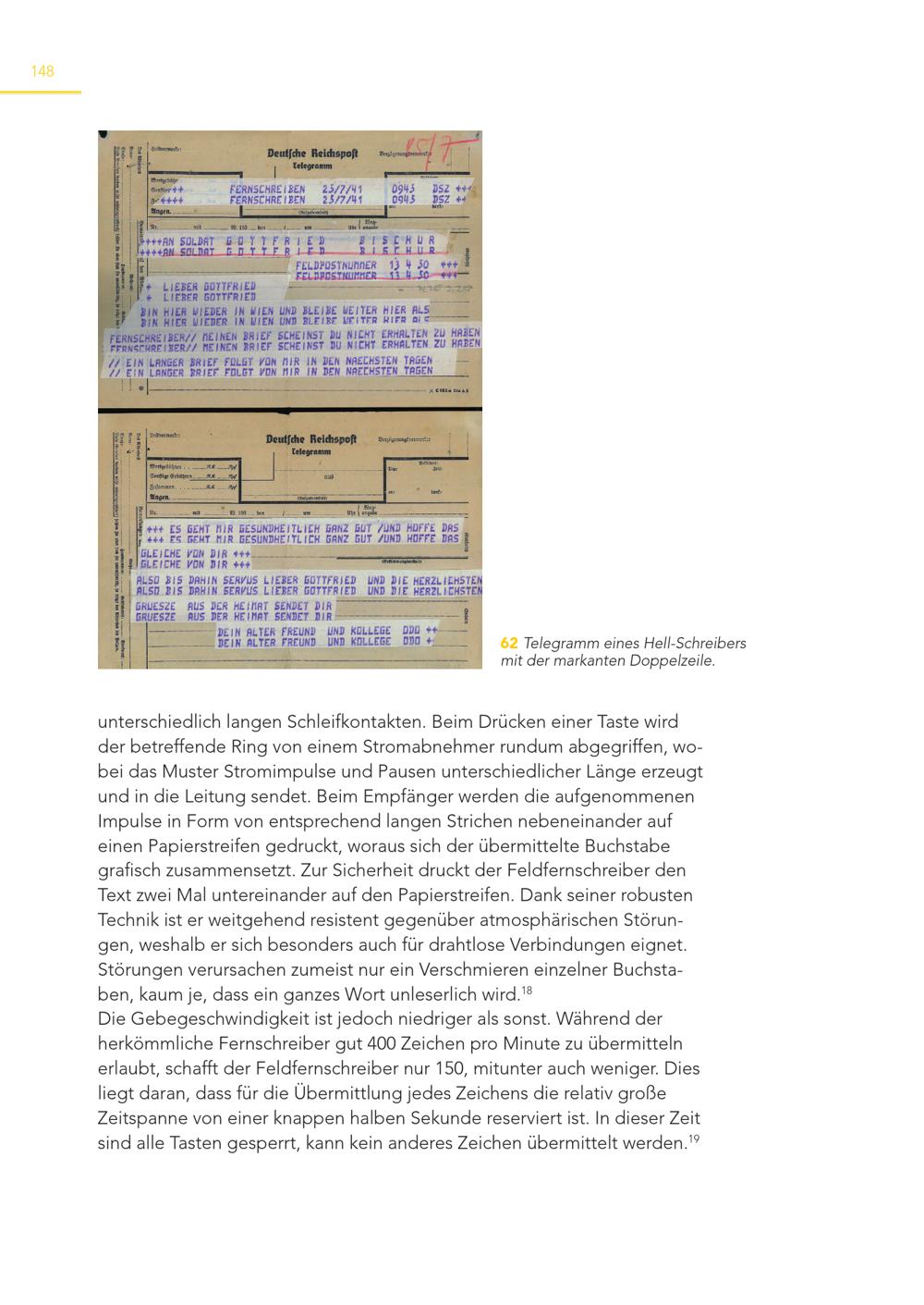 148 62 Telegramm eines Hell-Schreibers mit der markanten Doppelzeile. unterschiedlich langen Schleifkontakten. Beim Drücken einer Taste wird der betreffende Ring von einem Stromabnehmer rundum abgegriffen, wobei das Muster Stromimpulse und Pausen unterschiedlicher Länge erzeugt und in die Leitung sendet. Beim Empfänger werden die aufgenommenen Impulse in Form von entsprechend langen Strichen nebeneinander auf einen Papierstreifen gedruckt, woraus sich der übermittelte Buchstabe grafisch zusammensetzt. Zur Sicherheit druckt der Feldfernschreiber den Text zwei Mal untereinander auf den Papierstreifen. Dank seiner robusten Technik ist er weitgehend resistent gegenüber atmosphärischen Störungen, weshalb er sich besonders auch für drahtlose Verbindungen eignet. Störungen verursachen zumeist nur ein Verschmieren einzelner Buchstaben, kaum je, dass ein ganzes Wort unleserlich wird. 18 Die Gebegeschwindigkeit ist jedoch niedriger als sonst. Während der herkömmliche Fernschreiber gut 400 Zeichen pro Minute zu übermitteln erlaubt, schafft der Feldfernschreiber nur 150, mitunter auch weniger. Dies liegt daran, dass für die Übermittlung jedes Zeichens die relativ große Zeitspanne von einer knappen halben Sekunde reserviert ist. In dieser Zeit sind alle Tasten gesperrt, kann kein anderes Zeichen übermittelt werden. 19