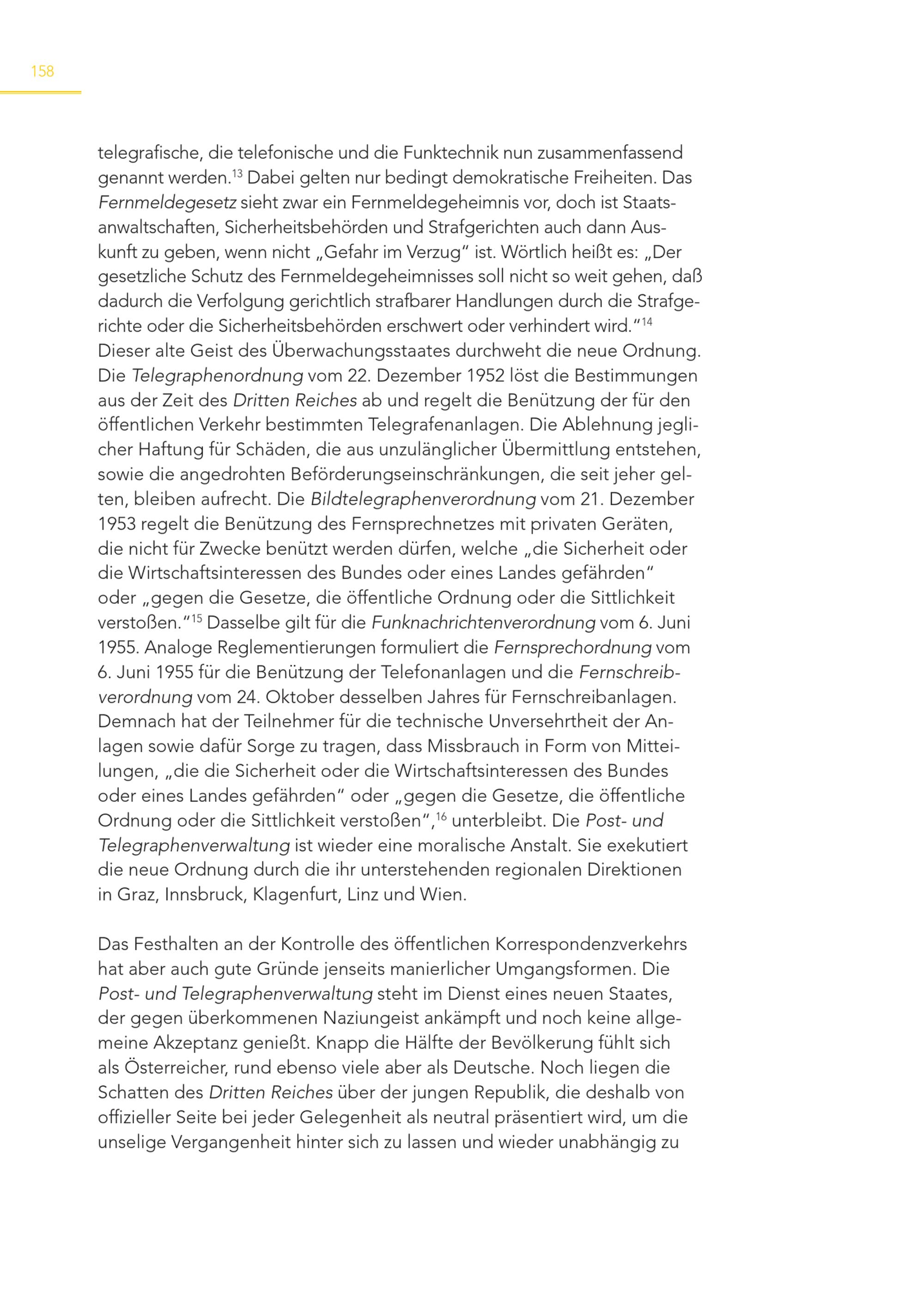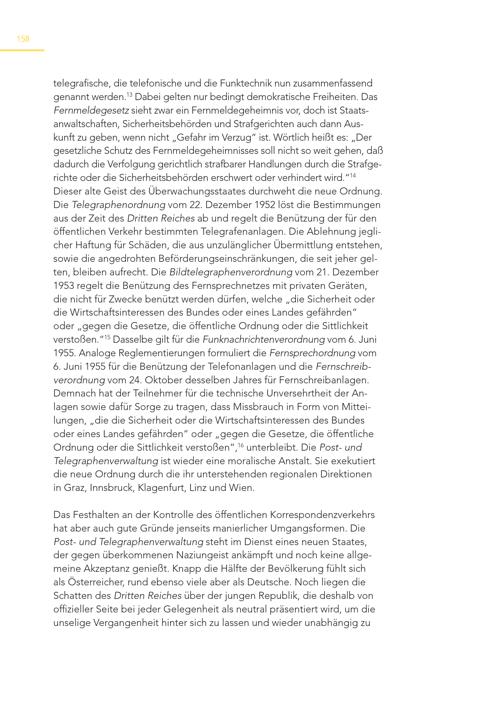 158 telegrafische, die telefonische und die Funktechnik nun zusammenfassend genannt werden. 13 Dabei gelten nur bedingt demokratische Freiheiten. Das Fernmeldegesetz sieht zwar ein Fernmeldegeheimnis vor, doch ist Staatsanwaltschaften, Sicherheitsbehörden und Strafgerichten auch dann Auskunft zu geben, wenn nicht„Gefahr im Verzug“ ist. Wörtlich heißt es:„Der gesetzliche Schutz des Fernmeldegeheimnisses soll nicht so weit gehen, daß dadurch die Verfolgung gerichtlich strafbarer Handlungen durch die Strafgerichte oder die Sicherheitsbehörden erschwert oder verhindert wird.“ 14 Dieser alte Geist des Überwachungsstaates durchweht die neue Ordnung. Die Telegraphenordnung vom 22. Dezember 1952 löst die Bestimmungen aus der Zeit des Dritten Reiches ab und regelt die Benützung der für den öffentlichen Verkehr bestimmten Telegrafenanlagen. Die Ablehnung jeglicher Haftung für Schäden, die aus unzulänglicher Übermittlung entstehen, sowie die angedrohten Beförderungseinschränkungen, die seit jeher gelten, bleiben aufrecht. Die Bildtelegraphenverordnung vom 21. Dezember 1953 regelt die Benützung des Fernsprechnetzes mit privaten Geräten, die nicht für Zwecke benützt werden dürfen, welche„die Sicherheit oder die Wirtschaftsinteressen des Bundes oder eines Landes gefährden“ oder„gegen die Gesetze, die öffentliche Ordnung oder die Sittlichkeit verstoßen.“ 15 Dasselbe gilt für die Funknachrichtenverordnung vom 6. Juni 1955. Analoge Reglementierungen formuliert die Fernsprechordnung vom 6. Juni 1955 für die Benützung der Telefonanlagen und die Fernschreibverordnung vom 24. Oktober desselben Jahres für Fernschreibanlagen. Demnach hat der Teilnehmer für die technische Unversehrtheit der Anlagen sowie dafür Sorge zu tragen, dass Missbrauch in Form von Mitteilungen,„die die Sicherheit oder die Wirtschaftsinteressen des Bundes oder eines Landes gefährden“ oder„gegen die Gesetze, die öffentliche Ordnung oder die Sittlichkeit verstoßen“, 16 unterbleibt. Die Post- und Telegraphenverwaltung ist wieder eine moralische Anstalt. Sie exekutiert die neue Ordnung durch die ihr unterstehenden regionalen Direktionen in Graz, Innsbruck, Klagenfurt, Linz und Wien. Das Festhalten an der Kontrolle des öffentlichen Korrespondenzverkehrs hat aber auch gute Gründe jenseits manierlicher Umgangsformen. Die Post- und Telegraphenverwaltung steht im Dienst eines neuen Staates, der gegen überkommenen Naziungeist ankämpft und noch keine allgemeine Akzeptanz genießt. Knapp die Hälfte der Bevölkerung fühlt sich als Österreicher, rund ebenso viele aber als Deutsche. Noch liegen die Schatten des Dritten Reiches über der jungen Republik, die deshalb von offizieller Seite bei jeder Gelegenheit als neutral präsentiert wird, um die unselige Vergangenheit hinter sich zu lassen und wieder unabhängig zu
