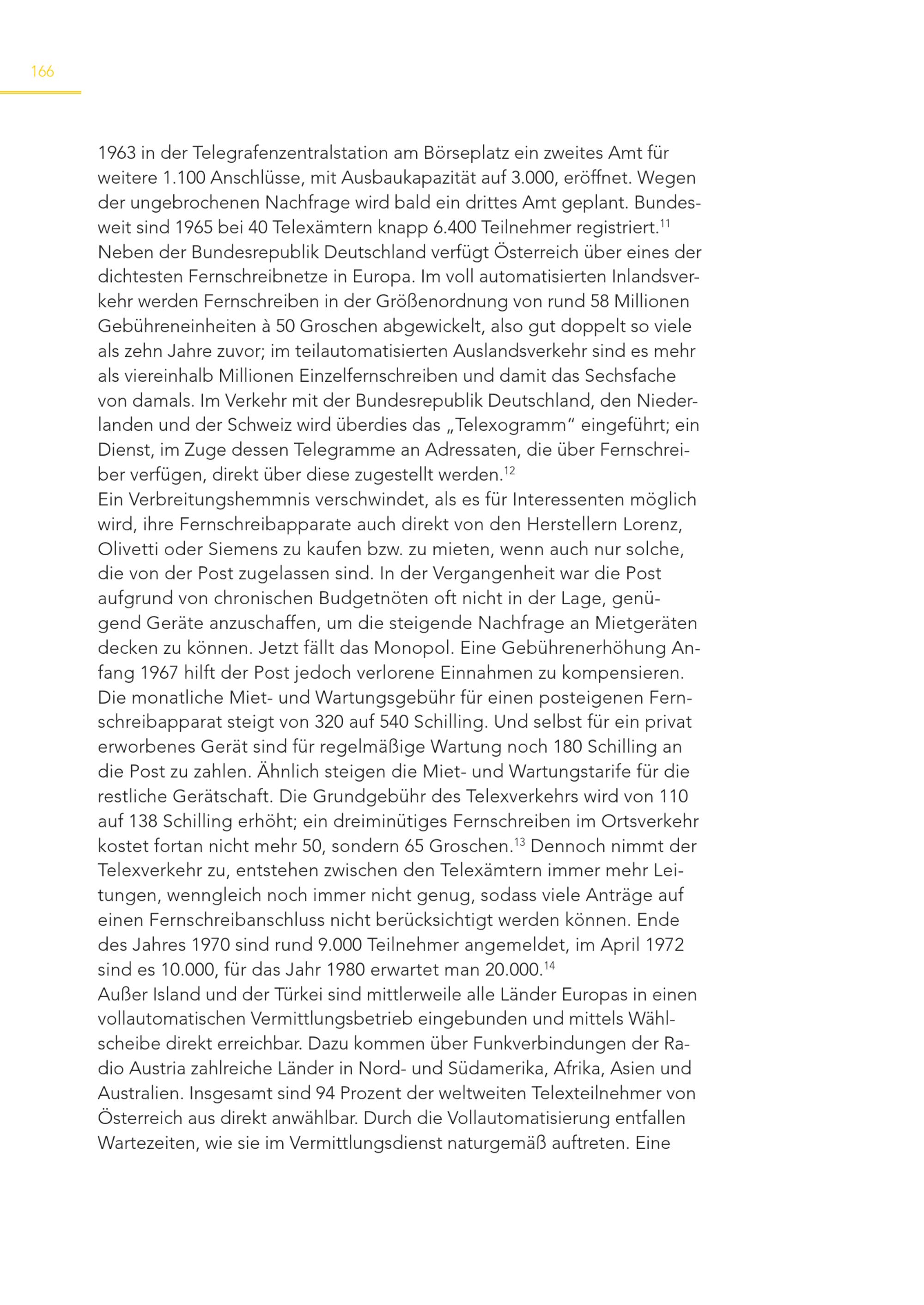 166 1963 in der Telegrafenzentralstation am Börseplatz ein zweites Amt für weitere 1.100 Anschlüsse, mit Ausbaukapazität auf 3.000, eröffnet. Wegen der ungebrochenen Nachfrage wird bald ein drittes Amt geplant. Bundesweit sind 1965 bei 40 Telexämtern knapp 6.400 Teilnehmer registriert. 11 Neben der Bundesrepublik Deutschland verfügt Österreich über eines der dichtesten Fernschreibnetze in Europa. Im voll automatisierten Inlandsverkehr werden Fernschreiben in der Größenordnung von rund 58 Millionen Gebühreneinheiten à 50 Groschen abgewickelt, also gut doppelt so viele als zehn Jahre zuvor; im teilautomatisierten Auslandsverkehr sind es mehr als viereinhalb Millionen Einzelfernschreiben und damit das Sechsfache von damals. Im Verkehr mit der Bundesrepublik Deutschland, den Niederlanden und der Schweiz wird überdies das„Telexogramm“ eingeführt; ein Dienst, im Zuge dessen Telegramme an Adressaten, die über Fernschreiber verfügen, direkt über diese zugestellt werden. 12 Ein Verbreitungshemmnis verschwindet, als es für Interessenten möglich wird, ihre Fernschreibapparate auch direkt von den Herstellern Lorenz, Olivetti oder Siemens zu kaufen bzw. zu mieten, wenn auch nur solche, die von der Post zugelassen sind. In der Vergangenheit war die Post aufgrund von chronischen Budgetnöten oft nicht in der Lage, genügend Geräte anzuschaffen, um die steigende Nachfrage an Mietgeräten decken zu können. Jetzt fällt das Monopol. Eine Gebührenerhöhung Anfang 1967 hilft der Post jedoch verlorene Einnahmen zu kompensieren. Die monatliche Miet- und Wartungsgebühr für einen posteigenen Fernschreibapparat steigt von 320 auf 540 Schilling. Und selbst für ein privat erworbenes Gerät sind für regelmäßige Wartung noch 180 Schilling an die Post zu zahlen. Ähnlich steigen die Miet- und Wartungstarife für die restliche Gerätschaft. Die Grundgebühr des Telexverkehrs wird von 110 auf 138 Schilling erhöht; ein dreiminütiges Fernschreiben im Ortsverkehr kostet fortan nicht mehr 50, sondern 65 Groschen. 13 Dennoch nimmt der Telexverkehr zu, entstehen zwischen den Telexämtern immer mehr Leitungen, wenngleich noch immer nicht genug, sodass viele Anträge auf einen Fernschreibanschluss nicht berücksichtigt werden können. Ende des Jahres 1970 sind rund 9.000 Teilnehmer angemeldet, im April 1972 sind es 10.000, für das Jahr 1980 erwartet man 20.000. 14 Außer Island und der Türkei sind mittlerweile alle Länder Europas in einen vollautomatischen Vermittlungsbetrieb eingebunden und mittels Wählscheibe direkt erreichbar. Dazu kommen über Funkverbindungen der Radio Austria zahlreiche Länder in Nord- und Südamerika, Afrika, Asien und Australien. Insgesamt sind 94 Prozent der weltweiten Telexteilnehmer von Österreich aus direkt anwählbar. Durch die Vollautomatisierung entfallen Wartezeiten, wie sie im Vermittlungsdienst naturgemäß auftreten. Eine