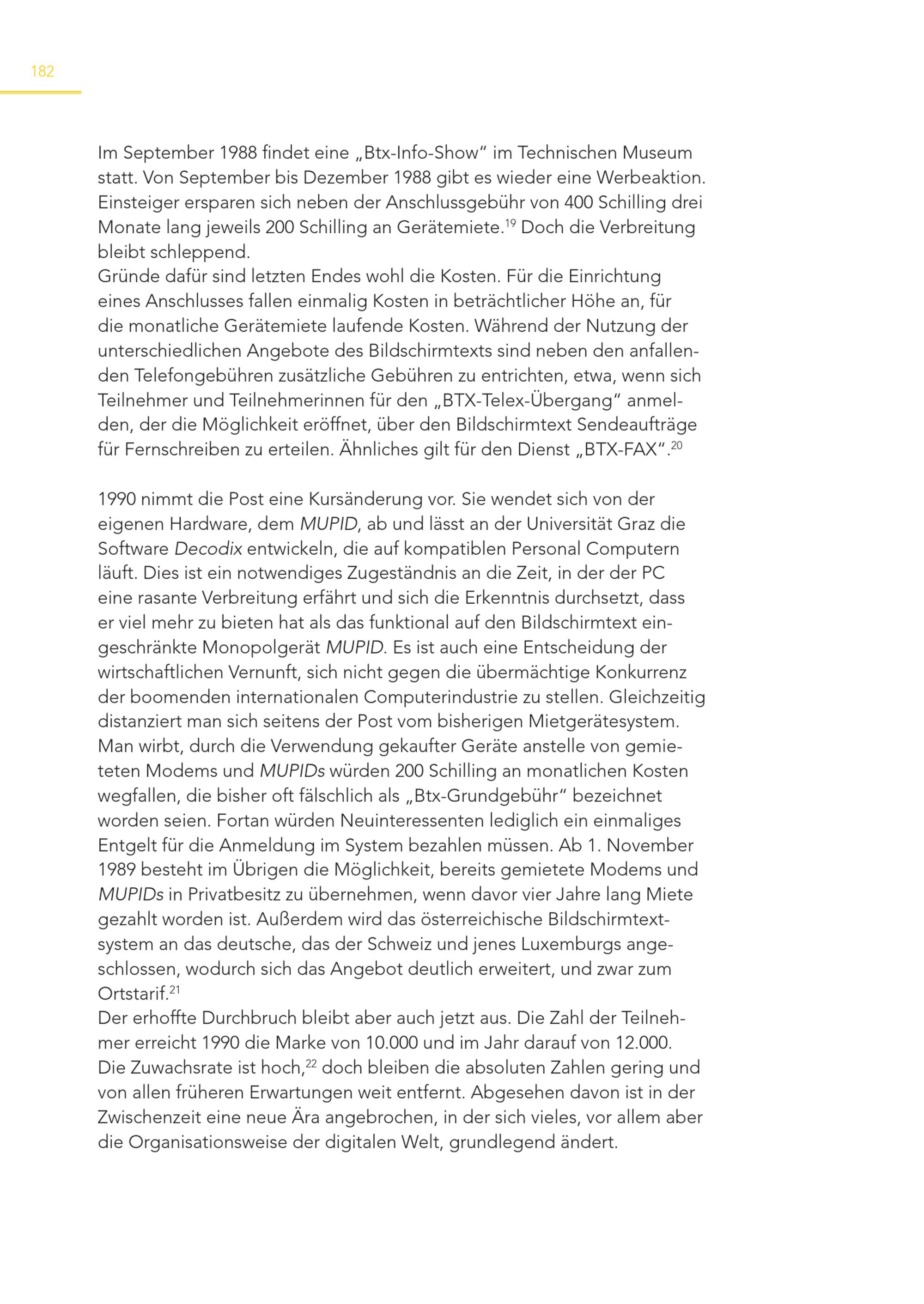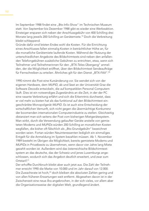 182 Im September 1988 findet eine„Btx-Info-Show“ im Technischen Museum statt. Von September bis Dezember 1988 gibt es wieder eine Werbeaktion. Einsteiger ersparen sich neben der Anschlussgebühr von 400 Schilling drei Monate lang jeweils 200 Schilling an Gerätemiete. 19 Doch die Verbreitung bleibt schleppend. Gründe dafür sind letzten Endes wohl die Kosten. Für die Einrichtung eines Anschlusses fallen einmalig Kosten in beträchtlicher Höhe an, für die monatliche Gerätemiete laufende Kosten. Während der Nutzung der unterschiedlichen Angebote des Bildschirmtexts sind neben den anfallenden Telefongebühren zusätzliche Gebühren zu entrichten, etwa, wenn sich Teilnehmer und Teilnehmerinnen für den„BTX-Telex-Übergang“ anmelden, der die Möglichkeit eröffnet, über den Bildschirmtext Sendeaufträge für Fernschreiben zu erteilen. Ähnliches gilt für den Dienst„BTX-FAX“. 20 1990 nimmt die Post eine Kursänderung vor. Sie wendet sich von der eigenen Hardware, dem MUPID , ab und lässt an der Universität Graz die Software Decodix entwickeln, die auf kompatiblen Personal Computern läuft. Dies ist ein notwendiges Zugeständnis an die Zeit, in der der PC eine rasante Verbreitung erfährt und sich die Erkenntnis durchsetzt, dass er viel mehr zu bieten hat als das funktional auf den Bildschirmtext eingeschränkte Monopolgerät MUPID . Es ist auch eine Entscheidung der wirtschaftlichen Vernunft, sich nicht gegen die übermächtige Konkurrenz der boomenden internationalen Computerindustrie zu stellen. Gleichzeitig distanziert man sich seitens der Post vom bisherigen Mietgerätesystem. Man wirbt, durch die Verwendung gekaufter Geräte anstelle von gemieteten Modems und MUPIDs würden 200 Schilling an monatlichen Kosten wegfallen, die bisher oft fälschlich als„Btx-Grundgebühr“ bezeichnet worden seien. Fortan würden Neuinteressenten lediglich ein einmaliges Entgelt für die Anmeldung im System bezahlen müssen. Ab 1. November 1989 besteht im Übrigen die Möglichkeit, bereits gemietete Modems und MUPIDs in Privatbesitz zu übernehmen, wenn davor vier Jahre lang Miete gezahlt worden ist. Außerdem wird das österreichische Bildschirmtextsystem an das deutsche, das der Schweiz und jenes Luxemburgs angeschlossen, wodurch sich das Angebot deutlich erweitert, und zwar zum Ortstarif. 21 Der erhoffte Durchbruch bleibt aber auch jetzt aus. Die Zahl der Teilnehmer erreicht 1990 die Marke von 10.000 und im Jahr darauf von 12.000. Die Zuwachsrate ist hoch, 22 doch bleiben die absoluten Zahlen gering und von allen früheren Erwartungen weit entfernt. Abgesehen davon ist in der Zwischenzeit eine neue Ära angebrochen, in der sich vieles, vor allem aber die Organisationsweise der digitalen Welt, grundlegend ändert.