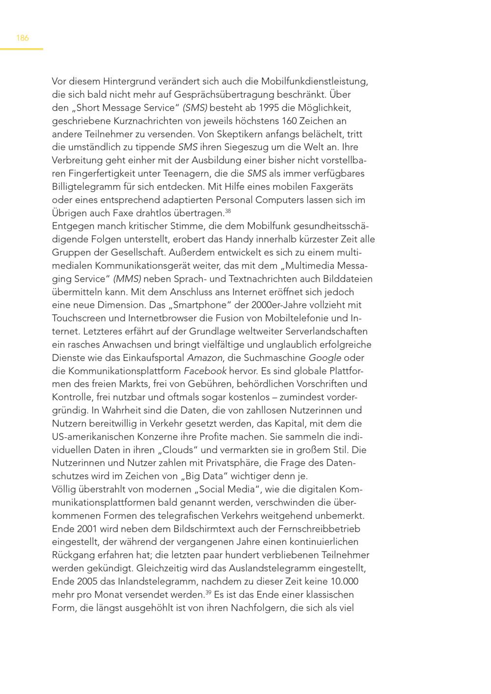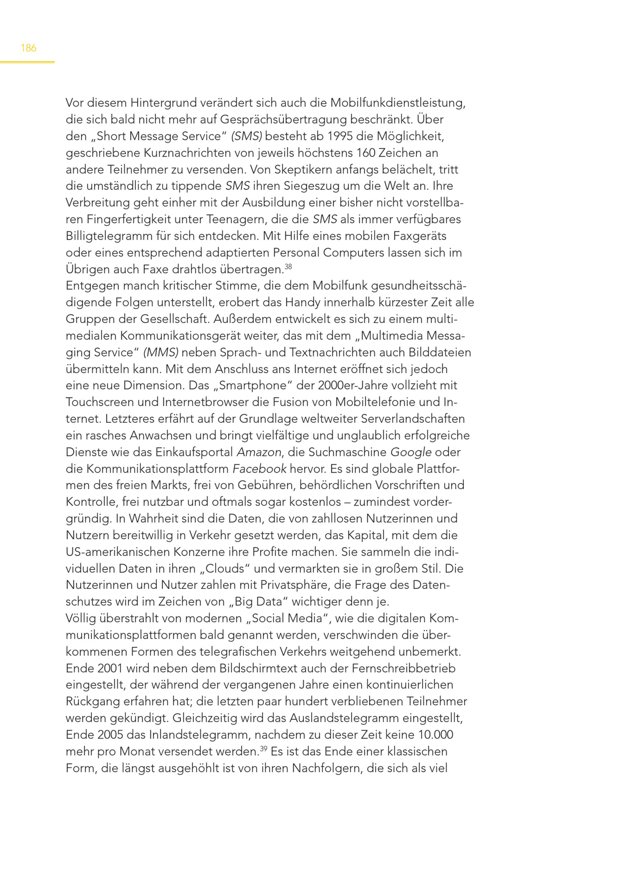 186 Vor diesem Hintergrund verändert sich auch die Mobilfunkdienstleistung, die sich bald nicht mehr auf Gesprächsübertragung beschränkt. Über den„Short Message Service“ (SMS) besteht ab 1995 die Möglichkeit, geschriebene Kurznachrichten von jeweils höchstens 160 Zeichen an andere Teilnehmer zu versenden. Von Skeptikern anfangs belächelt, tritt die umständlich zu tippende SMS ihren Siegeszug um die Welt an. Ihre Verbreitung geht einher mit der Ausbildung einer bisher nicht vorstellbaren Fingerfertigkeit unter Teenagern, die die SMS als immer verfügbares Billigtelegramm für sich entdecken. Mit Hilfe eines mobilen Faxgeräts oder eines entsprechend adaptierten Personal Computers lassen sich im Übrigen auch Faxe drahtlos übertragen. 38 Entgegen manch kritischer Stimme, die dem Mobilfunk gesundheitsschädigende Folgen unterstellt, erobert das Handy innerhalb kürzester Zeit alle Gruppen der Gesellschaft. Außerdem entwickelt es sich zu einem multimedialen Kommunikationsgerät weiter, das mit dem„Multimedia Messaging Service“ (MMS) neben Sprach- und Textnachrichten auch Bilddateien übermitteln kann. Mit dem Anschluss ans Internet eröffnet sich jedoch eine neue Dimension. Das„Smartphone“ der 2000er-Jahre vollzieht mit Touchscreen und Internetbrowser die Fusion von Mobiltelefonie und Internet. Letzteres erfährt auf der Grundlage weltweiter Serverlandschaften ein rasches Anwachsen und bringt vielfältige und unglaublich erfolgreiche Dienste wie das Einkaufsportal Amazon , die Suchmaschine Google oder die Kommunikationsplattform Facebook hervor. Es sind globale Plattformen des freien Markts, frei von Gebühren, behördlichen Vorschriften und Kontrolle, frei nutzbar und oftmals sogar kostenlos – zumindest vordergründig. In Wahrheit sind die Daten, die von zahllosen Nutzerinnen und Nutzern bereitwillig in Verkehr gesetzt werden, das Kapital, mit dem die US-amerikanischen Konzerne ihre Profite machen. Sie sammeln die individuellen Daten in ihren„Clouds“ und vermarkten sie in großem Stil. Die Nutzerinnen und Nutzer zahlen mit Privatsphäre, die Frage des Datenschutzes wird im Zeichen von„Big Data“ wichtiger denn je. Völlig überstrahlt von modernen„Social Media“, wie die digitalen Kommunikationsplattformen bald genannt werden, verschwinden die überkommenen Formen des telegrafischen Verkehrs weitgehend unbemerkt. Ende 2001 wird neben dem Bildschirmtext auch der Fernschreibbetrieb eingestellt, der während der vergangenen Jahre einen kontinuierlichen Rückgang erfahren hat; die letzten paar hundert verbliebenen Teilnehmer werden gekündigt. Gleichzeitig wird das Auslandstelegramm eingestellt, Ende 2005 das Inlandstelegramm, nachdem zu dieser Zeit keine 10.000 mehr pro Monat versendet werden. 39 Es ist das Ende einer klassischen Form, die längst ausgehöhlt ist von ihren Nachfolgern, die sich als viel