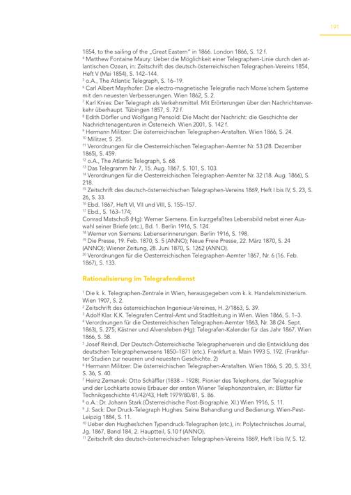 191 1854, to the sailing of the„Great Eastern“ in 1866. London 1866, S. 12 f. 4 Matthew Fontaine Maury: Ueber die Möglichkeit einer Telegraphen-Linie durch den atlantischen Ozean, in: Zeitschrift des deutsch-österreichischen Telegraphen-Vereins 1854, Heft V(Mai 1854), S. 142–144. 5 o.A., The Atlantic Telegraph, S. 16–19. 6 Carl Albert Mayrhofer: Die electro-magnetische Telegrafie nach Morse´schem Systeme mit den neuesten Verbesserungen. Wien 1862, S. 2. 7 Karl Knies: Der Telegraph als Verkehrsmittel. Mit Erörterungen über den Nachrichtenverkehr überhaupt. Tübingen 1857, S. 72 f. 8 Edith Dörfler und Wolfgang Pensold: Die Macht der Nachricht: die Geschichte der Nachrichtenagenturen in Österreich. Wien 2001, S. 142 f. 9 Hermann Militzer: Die österreichischen Telegraphen-Anstalten. Wien 1866, S. 24. 10 Militzer, S. 25. 11 Verordnungen für die Oesterreichischen Telegraphen-Aemter Nr. 53(28. Dezember 1865), S. 459. 12 o.A., The Atlantic Telegraph, S. 68. 13 Das Telegramm Nr. 7, 15. Aug. 1867, S. 101, S. 103. 14 Verordnungen für die Oesterreichischen Telegraphen-Aemter Nr. 32(18. Aug. 1866), S. 218. 15 Zeitschrift des deutsch-österreichischen Telegraphen-Vereins 1869, Heft I bis IV, S. 23, S. 26, S. 33. 16 Ebd. 1867, Heft VI, VII und VIII, S. 155–157. 17 Ebd., S. 163–174; Conrad Matschoß(Hg): Werner Siemens. Ein kurzgefaßtes Lebensbild nebst einer Auswahl seiner Briefe(etc.), Bd. 1. Berlin 1916, S. 124. 18 Werner von Siemens: Lebenserinnerungen. Berlin 1916, S. 198. 19 Die Presse, 19. Feb. 1870, S. 5(ANNO); Neue Freie Presse, 22. März 1870, S. 24 (ANNO); Wiener Zeitung, 28. Juni 1870, S. 1262(ANNO). 20 Verordnungen für die Oesterreichischen Telegraphen-Aemter 1867, Nr. 6(16. Feb. 1867), S. 133. Rationalisierung im Telegrafendienst 1 Die k. k. Telegraphen-Zentrale in Wien, herausgegeben vom k. k. Handelsministerium. Wien 1907, S. 2. 2 Zeitschrift des österreichischen Ingenieur-Vereines, H. 2/1863, S. 39. 3 Adolf Klar. K.K. Telegrafen Central-Amt und Stadtleitung in Wien. Wien 1866, S. 1–3. 4 Verordnungen für die Oesterreichischen Telegraphen-Aemter 1863, Nr. 38(24. Sept. 1863), S. 275; Kästner und Alvensleben(Hg): Telegrafen-Kalender für das Jahr 1867. Wien 1866, S. 58. 5 Josef Reindl, Der Deutsch-Österreichische Telegraphenverein und die Entwicklung des deutschen Telegraphenwesens 1850–1871(etc.). Frankfurt a. Main 1993 S. 192.(Frankfurter Studien zur neueren und neuesten Geschichte. 2) 6 Hermann Militzer: Die österreichischen Telegraphen-Anstalten. Wien 1866, S. 20, S. 33 f, S. 36, S. 40. 7 Heinz Zemanek: Otto Schäffler(1838 – 1928). Pionier des Telephons, der Telegraphie und der Lochkarte sowie Erbauer der ersten Wiener Telephonzentralen, in: Blätter für Technikgeschichte 41/42/43, Heft 1979/80/81, S. 86. 8 o.A.: Dr. Johann Stark(Österreichische Post-Biographie. XI.) Wien 1916, S. 11. 9 J. Sack: Der Druck-Telegraph Hughes. Seine Behandlung und Bedienung. Wien-PestLeipzig 1884, S. 11. 10 Ueber den Hughes’schen Typendruck-Telegraphen(etc.), in: Polytechnisches Journal, Jg. 1867, Band 184, 2. Hauptteil, S.10 f(ANNO). 11 Zeitschrift des deutsch-österreichischen Telegraphen-Vereins 1869, Heft I bis IV, S. 12.
