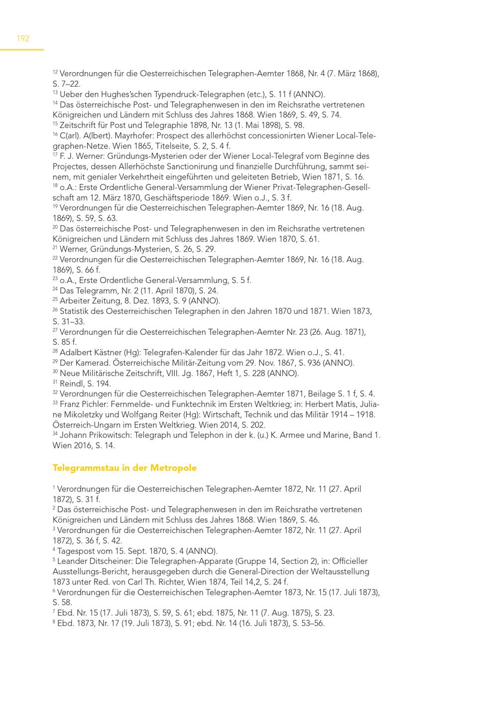 192 12 Verordnungen für die Oesterreichischen Telegraphen-Aemter 1868, Nr. 4(7. März 1868), S. 7–22. 13 Ueber den Hughes’schen Typendruck-Telegraphen(etc.), S. 11 f(ANNO). 14 Das österreichische Post- und Telegraphenwesen in den im Reichsrathe vertretenen Königreichen und Ländern mit Schluss des Jahres 1868. Wien 1869, S. 49, S. 74. 15 Zeitschrift für Post und Telegraphie 1898, Nr. 13(1. Mai 1898), S. 98. 16 C(arl). A(lbert). Mayrhofer: Prospect des allerhöchst concessionirten Wiener Local-Telegraphen-Netze. Wien 1865, Titelseite, S. 2, S. 4 f. 17 F. J. Werner: Gründungs-Mysterien oder der Wiener Local-Telegraf vom Beginne des Projectes, dessen Allerhöchste Sanctionirung und finanzielle Durchführung, sammt seinem, mit genialer Verkehrtheit eingeführten und geleiteten Betrieb, Wien 1871, S. 16. 18 o.A.: Erste Ordentliche General-Versammlung der Wiener Privat-Telegraphen-Gesellschaft am 12. März 1870, Geschäftsperiode 1869. Wien o.J., S. 3 f. 19 Verordnungen für die Oesterreichischen Telegraphen-Aemter 1869, Nr. 16(18. Aug. 1869), S. 59, S. 63. 20 Das österreichische Post- und Telegraphenwesen in den im Reichsrathe vertretenen Königreichen und Ländern mit Schluss des Jahres 1869. Wien 1870, S. 61. 21 Werner, Gründungs-Mysterien, S. 26, S. 29. 22 Verordnungen für die Oesterreichischen Telegraphen-Aemter 1869, Nr. 16(18. Aug. 1869), S. 66 f. 23 o.A., Erste Ordentliche General-Versammlung, S. 5 f. 24 Das Telegramm, Nr. 2(11. April 1870), S. 24. 25 Arbeiter Zeitung, 8. Dez. 1893, S. 9(ANNO). 26 Statistik des Oesterreichischen Telegraphen in den Jahren 1870 und 1871. Wien 1873, S. 31–33. 27 Verordnungen für die Oesterreichischen Telegraphen-Aemter Nr. 23(26. Aug. 1871), S. 85 f. 28 Adalbert Kästner(Hg): Telegrafen-Kalender für das Jahr 1872. Wien o.J., S. 41. 29 Der Kamerad. Österreichische Militär-Zeitung vom 29. Nov. 1867, S. 936(ANNO). 30 Neue Militärische Zeitschrift, VIII. Jg. 1867, Heft 1, S. 228(ANNO). 31 Reindl, S. 194. 32 Verordnungen für die Oesterreichischen Telegraphen-Aemter 1871, Beilage S. 1 f, S. 4. 33 Franz Pichler: Fernmelde- und Funktechnik im Ersten Weltkrieg; in: Herbert Matis, Juliane Mikoletzky und Wolfgang Reiter(Hg): Wirtschaft, Technik und das Militär 1914 – 1918. Österreich-Ungarn im Ersten Weltkrieg. Wien 2014, S. 202. 34 Johann Prikowitsch: Telegraph und Telephon in der k.(u.) K. Armee und Marine, Band 1. Wien 2016, S. 14. Telegrammstau in der Metropole 1 Verordnungen für die Oesterreichischen Telegraphen-Aemter 1872, Nr. 11(27. April 1872), S. 31 f. 2 Das österreichische Post- und Telegraphenwesen in den im Reichsrathe vertretenen Königreichen und Ländern mit Schluss des Jahres 1868. Wien 1869, S. 46. 3 Verordnungen für die Oesterreichischen Telegraphen-Aemter 1872, Nr. 11(27. April 1872), S. 36 f, S. 42. 4 Tagespost vom 15. Sept. 1870, S. 4(ANNO). 5 Leander Ditscheiner: Die Telegraphen-Apparate(Gruppe 14, Section 2), in: Officieller Ausstellungs-Bericht, herausgegeben durch die General-Direction der Weltausstellung 1873 unter Red. von Carl Th. Richter, Wien 1874, Teil 14,2, S. 24 f. 6 Verordnungen für die Oesterreichischen Telegraphen-Aemter 1873, Nr. 15(17. Juli 1873), S. 58. 7 Ebd. Nr. 15(17. Juli 1873), S. 59, S. 61; ebd. 1875, Nr. 11(7. Aug. 1875), S. 23. 8 Ebd. 1873, Nr. 17(19. Juli 1873), S. 91; ebd. Nr. 14(16. Juli 1873), S. 53–56.