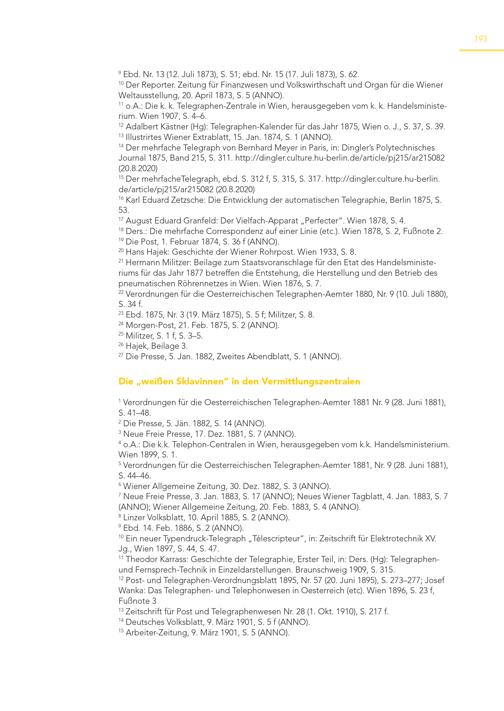 193 9 Ebd. Nr. 13(12. Juli 1873), S. 51; ebd. Nr. 15(17. Juli 1873), S. 62. 10 Der Reporter. Zeitung für Finanzwesen und Volkswirthschaft und Organ für die Wiener Weltausstellung, 20. April 1873, S. 5(ANNO). 11 o.A.: Die k. k. Telegraphen-Zentrale in Wien, herausgegeben vom k. k. Handelsministerium. Wien 1907, S. 4–6. 12 Adalbert Kästner(Hg): Telegraphen-Kalender für das Jahr 1875, Wien o. J., S. 37, S. 39. 13 Illustrirtes Wiener Extrablatt, 15. Jan. 1874, S. 1(ANNO). 14 Der mehrfache Telegraph von Bernhard Meyer in Paris, in: Dingler’s Polytechnisches Journal 1875, Band 215, S. 311. http://dingler.culture.hu-berlin.de/article/pj215/ar215082 (20.8.2020) 15 Der mehrfacheTelegraph, ebd. S. 312 f, S. 315, S. 317. http://dingler.culture.hu-berlin. de/article/pj215/ar215082(20.8.2020) 16 Karl Eduard Zetzsche: Die Entwicklung der automatischen Telegraphie, Berlin 1875, S. 53. 17 August Eduard Granfeld: Der Vielfach-Apparat„Perfecter“. Wien 1878, S. 4. 18 Ders.: Die mehrfache Correspondenz auf einer Linie(etc.). Wien 1878, S. 2, Fußnote 2. 19 Die Post, 1. Februar 1874, S. 36 f(ANNO). 20 Hans Hajek: Geschichte der Wiener Rohrpost. Wien 1933, S. 8. 21 Hermann Militzer: Beilage zum Staatsvoranschlage für den Etat des Handelsministeriums für das Jahr 1877 betreffen die Entstehung, die Herstellung und den Betrieb des pneumatischen Röhrennetzes in Wien. Wien 1876, S. 7. 22 Verordnungen für die Oesterreichischen Telegraphen-Aemter 1880, Nr. 9(10. Juli 1880), S. 34 f. 23 Ebd. 1875, Nr. 3(19. März 1875), S. 5 f; Militzer, S. 8. 24 Morgen-Post, 21. Feb. 1875, S. 2(ANNO). 25 Militzer, S. 1 f, S. 3–5. 26 Hajek, Beilage 3. 27 Die Presse, 5. Jan. 1882, Zweites Abendblatt, S. 1(ANNO). Die„weißen Sklavinnen“ in den Vermittlungszentralen 1 Verordnungen für die Oesterreichischen Telegraphen-Aemter 1881 Nr. 9(28. Juni 1881), S. 41–48. 2 Die Presse, 5. Jän. 1882, S. 14(ANNO). 3 Neue Freie Presse, 17. Dez. 1881, S. 7(ANNO). 4 o.A.: Die k.k. Telephon-Centralen in Wien, herausgegeben vom k.k. Handelsministerium. Wien 1899, S. 1. 5 Verordnungen für die Oesterreichischen Telegraphen-Aemter 1881, Nr. 9(28. Juni 1881), S. 44–46. 6 Wiener Allgemeine Zeitung, 30. Dez. 1882, S. 3(ANNO). 7 Neue Freie Presse, 3. Jan. 1883, S. 17(ANNO); Neues Wiener Tagblatt, 4. Jan. 1883, S. 7 (ANNO); Wiener Allgemeine Zeitung, 20. Feb. 1883, S. 4(ANNO). 8 Linzer Volksblatt, 10. April 1885, S. 2(ANNO). 9 Ebd. 14. Feb. 1886, S. 2(ANNO). 10 Ein neuer Typendruck-Telegraph„Télescripteur“, in: Zeitschrift für Elektrotechnik XV. Jg., Wien 1897, S. 44, S. 47. 11 Theodor Karrass: Geschichte der Telegraphie, Erster Teil, in: Ders.(Hg): Telegraphenund Fernsprech-Technik in Einzeldarstellungen. Braunschweig 1909, S. 315. 12 Post- und Telegraphen-Verordnungsblatt 1895, Nr. 57(20. Juni 1895), S. 273–277; Josef Wanka: Das Telegraphen- und Telephonwesen in Oesterreich(etc). Wien 1896, S. 23 f, Fußnote 3 13 Zeitschrift für Post und Telegraphenwesen Nr. 28(1. Okt. 1910), S. 217 f. 14 Deutsches Volksblatt, 9. März 1901, S. 5 f(ANNO). 15 Arbeiter-Zeitung, 9. März 1901, S. 5(ANNO).