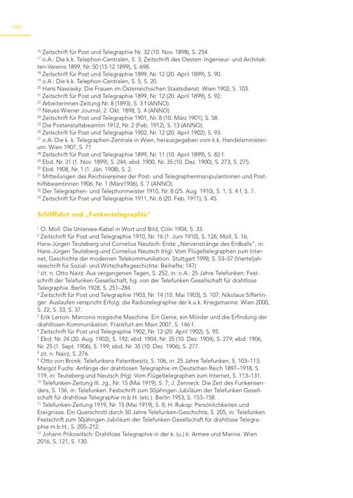 194 16 Zeitschrift für Post und Telegraphie Nr. 32(10. Nov. 1898), S. 254. 17 o.A.: Die k.k. Telephon-Centralen, S. 3; Zeitschrift des Oesterr. Ingenieur- und Architekten-Vereins 1899, Nr. 50(15.12.1899), S. 698. 18 Zeitschrift für Post und Telegraphie 1899, Nr. 12(20. April 1899), S. 90. 19 o.A.: Die k.k. Telephon-Centralen, S. 5, S. 20. 20 Hans Nawiasky: Die Frauen im Österreichischen Staatsdienst. Wien 1902, S. 103. 21 Zeitschrift für Post und Telegraphie 1899, Nr. 12(20. April 1899), S. 92. 22 Arbeiterinnen-Zeitung Nr. 8(1893), S. 3 f(ANNO). 23 Neues Wiener Journal, 2. Okt. 1898, S. 4(ANNO). 24 Zeitschrift für Post und Telegraphie 1901, Nr. 8(10. März 1901), S. 58. 25 Die Postanstaltsbeamtin 1912, Nr. 2(Feb. 1912), S. 13(ANNO). 26 Zeitschrift für Post und Telegraphie 1902, Nr. 12(20. April 1902), S. 93. 27 o.A: Die k. k. Telegraphen-Zentrale in Wien, herausgegeben vom k.k. Handelsministerium. Wien 1907, S. 71 28 Zeitschrift für Post und Telegraphie 1899, Nr. 11(10. April 1899), S. 82 f. 29 Ebd. Nr. 31(1. Nov. 1899), S. 244; ebd. 1900, Nr. 35(10. Dez. 1900), S. 273, S. 275. 30 Ebd. 1908, Nr. 1(1. Jän. 1908), S. 2. 31 Mitteilungen des Reichsvereines der Post- und Telegraphenmanipulantinnen und Posthilfsbeamtinnen 1906, Nr. 1(März1906), S. 7(ANNO). 32 Der Telegraphen- und Telephonmeister 1910, Nr. 8(25. Aug. 1910), S. 1, S. 4 f, S. 7. 33 Zeitschrift für Post und Telegraphie 1911, Nr. 6(20. Feb. 1911), S. 45. Schifffahrt und„Funkentelegraphie“ 1 O. Moll: Die Untersee-Kabel in Wort und Bild, Cöln 1904, S. 33. 2 Zeitschrift für Post und Telegraphie 1910, Nr. 16(1. Juni 1910), S. 126; Moll, S. 16; Hans-Jürgen Teuteberg und Cornelius Neutsch: Erste„Nervenstränge des Erdballs“, in: Hans-Jürgen Teuteberg und Cornelius Neutsch(Hg): Vom Flügeltelegraphen zum Internet, Geschichte der modernen Telekommunikation. Stuttgart 1998, S. 53–57.(Vierteljahresschrift für Sozial- und Wirtschaftsgeschichte: Beihefte; 147) 3 zit. n. Otto Nairz: Aus vergangenen Tagen, S. 252, in: o.A.: 25 Jahre Telefunken: Festschrift der Telefunken-Gesellschaft, hg. von der Telefunken Gesellschaft für drahtlose Telegraphie. Berlin 1928, S. 251–284. 4 Zeitschrift für Post und Telegraphie 1903, Nr. 14(10. Mai 1903), S. 107; Nikolaus Sifferlinger: Auslaufen verspricht Erfolg: die Radiotelegraphie der k.u.k. Kriegsmarine. Wien 2000, S. 22, S. 33, S. 37. 5 Erik Larson: Marconis magische Maschine. Ein Genie, ein Mörder und die Erfindung der drahtlosen Kommunikation. Frankfurt am Main 2007, S. 146 f. 6 Zeitschrift für Post und Telegraphie 1902, Nr. 12(20. April 1902), S. 95. 7 Ebd. Nr. 24(20. Aug. 1902), S. 192; ebd. 1904, Nr. 35(10. Dez. 1904), S. 279; ebd. 1906, Nr. 25(1. Sept. 1906), S. 199; ebd. Nr. 35(10. Dez. 1906), S. 277. 8 zit. n. Nairz, S. 276. 9 Otto von Bronk: Telefunkens Patentbesitz, S. 106, in: 25 Jahre Telefunken, S. 103–113; Margot Fuchs: Anfänge der drahtlosen Telegraphie im Deutschen Reich 1897–1918, S. 119, in: Teuteberg und Neutsch(Hg): Vom Flügeltelegraphen zum Internet, S. 113–131. 10 Telefunken-Zeitung III. Jg., Nr. 15(Mai 1919), S. 7; J. Zenneck: Die Zeit des Funkensenders, S. 156, in: Telefunken. Festschrift zum 50jährigen Jubiläum der Telefunken Gesellschaft für drahtlose Telegraphie m.b.H.(etc.). Berlin 1953, S. 153–158. 11 Telefunken-Zeitung 1919, Nr. 15(Mai 1919), S. 8; H. Rukop: Persönlichkeiten und Ereignisse. Ein Querschnitt durch 50 Jahre Telefunken-Geschichte, S. 205, in: Telefunken. Festschrift zum 50jährigen Jubiläum der Telefunken Gesellschaft für drahtlose Telegraphie m.b.H., S. 205–212. 12 Johann Prikowitsch: Drahtlose Telegraphie in der k.(u.) k. Armee und Marine. Wien 2016, S. 121, S. 130.