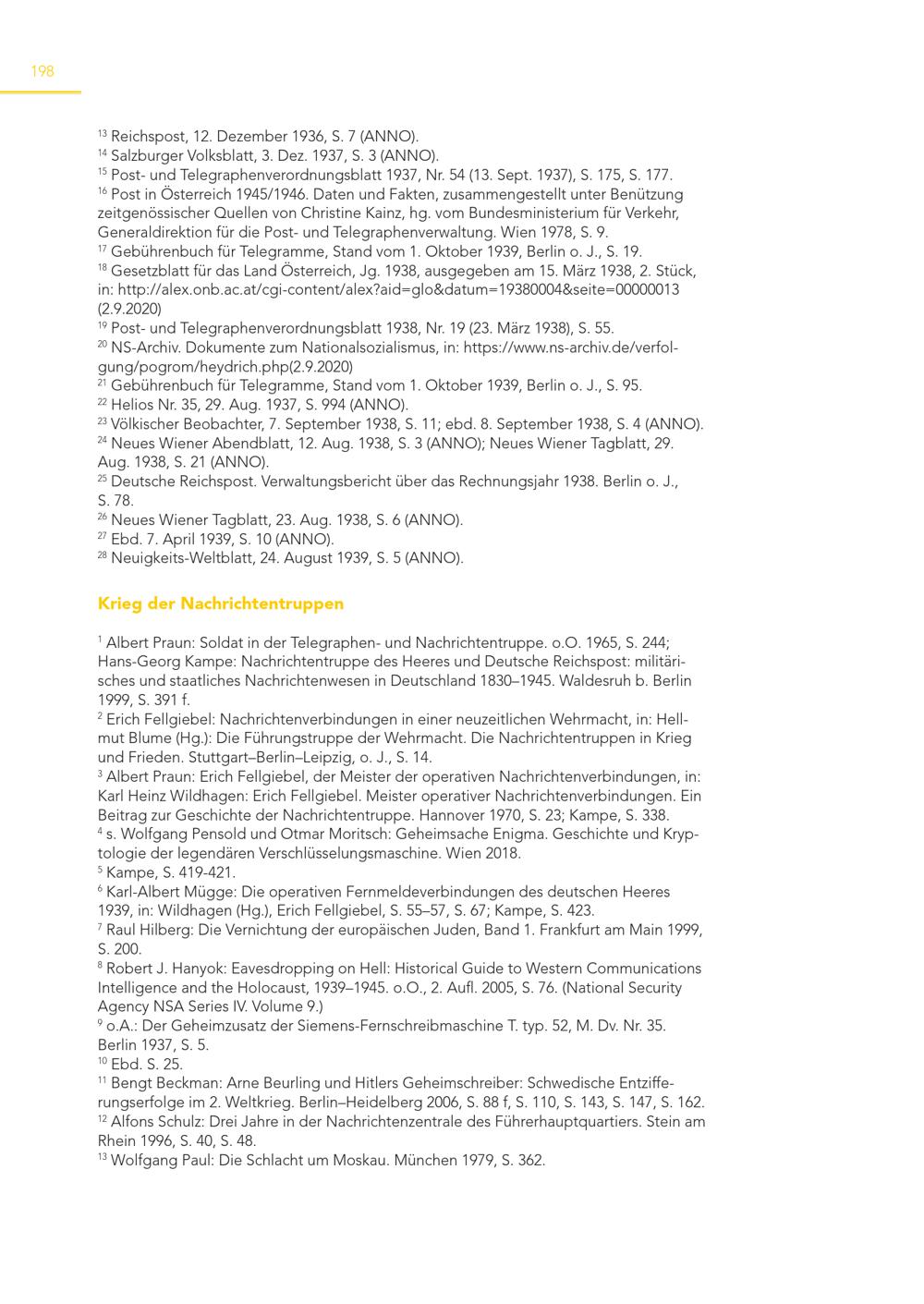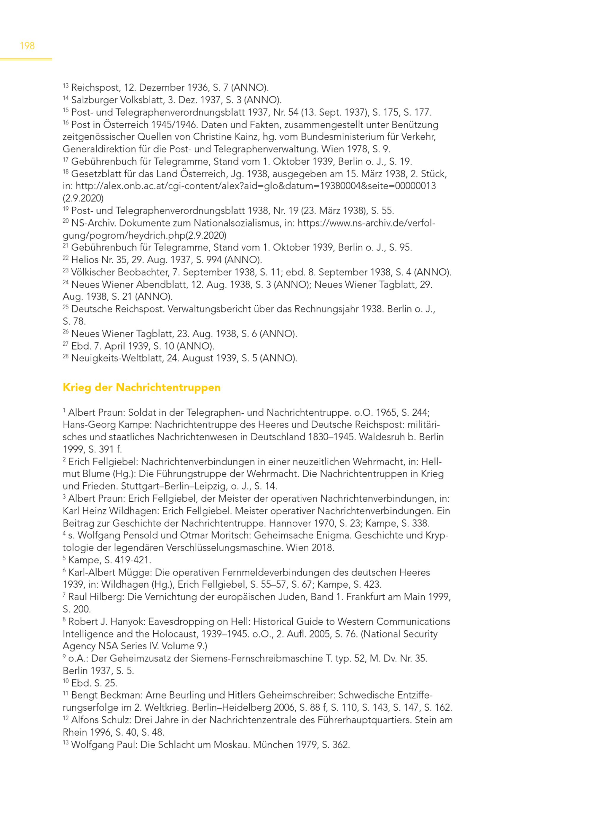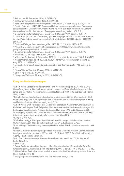 198 13 Reichspost, 12. Dezember 1936, S. 7(ANNO). 14 Salzburger Volksblatt, 3. Dez. 1937, S. 3(ANNO). 15 Post- und Telegraphenverordnungsblatt 1937, Nr. 54(13. Sept. 1937), S. 175, S. 177. 16 Post in Österreich 1945/1946. Daten und Fakten, zusammengestellt unter Benützung zeitgenössischer Quellen von Christine Kainz, hg. vom Bundesministerium für Verkehr, Generaldirektion für die Post- und Telegraphenverwaltung. Wien 1978, S. 9. 17 Gebührenbuch für Telegramme, Stand vom 1. Oktober 1939, Berlin o. J., S. 19. 18 Gesetzblatt für das Land Österreich, Jg. 1938, ausgegeben am 15. März 1938, 2. Stück, in: http://alex.onb.ac.at/cgi-content/alex?aid=glo&datum=19380004&seite=00000013 (2.9.2020) 19 Post- und Telegraphenverordnungsblatt 1938, Nr. 19(23. März 1938), S. 55. 20 NS-Archiv. Dokumente zum Nationalsozialismus, in: https://www.ns-archiv.de/verfolgung/pogrom/heydrich.php(2.9.2020) 21 Gebührenbuch für Telegramme, Stand vom 1. Oktober 1939, Berlin o. J., S. 95. 22 Helios Nr. 35, 29. Aug. 1937, S. 994(ANNO). 23 Völkischer Beobachter, 7. September 1938, S. 11; ebd. 8. September 1938, S. 4(ANNO). 24 Neues Wiener Abendblatt, 12. Aug. 1938, S. 3(ANNO); Neues Wiener Tagblatt, 29. Aug. 1938, S. 21(ANNO). 25 Deutsche Reichspost. Verwaltungsbericht über das Rechnungsjahr 1938. Berlin o. J., S. 78. 26 Neues Wiener Tagblatt, 23. Aug. 1938, S. 6(ANNO). 27 Ebd. 7. April 1939, S. 10(ANNO). 28 Neuigkeits-Weltblatt, 24. August 1939, S. 5(ANNO). Krieg der Nachrichtentruppen 1 Albert Praun: Soldat in der Telegraphen- und Nachrichtentruppe. o.O. 1965, S. 244; Hans-Georg Kampe: Nachrichtentruppe des Heeres und Deutsche Reichspost: militärisches und staatliches Nachrichtenwesen in Deutschland 1830–1945. Waldesruh b. Berlin 1999, S. 391 f. 2 Erich Fellgiebel: Nachrichtenverbindungen in einer neuzeitlichen Wehrmacht, in: Hellmut Blume(Hg.): Die Führungstruppe der Wehrmacht. Die Nachrichtentruppen in Krieg und Frieden. Stuttgart–Berlin–Leipzig, o. J., S. 14. 3 Albert Praun: Erich Fellgiebel, der Meister der operativen Nachrichtenverbindungen, in: Karl Heinz Wildhagen: Erich Fellgiebel. Meister operativer Nachrichtenverbindungen. Ein Beitrag zur Geschichte der Nachrichtentruppe. Hannover 1970, S. 23; Kampe, S. 338. 4 s. Wolfgang Pensold und Otmar Moritsch: Geheimsache Enigma. Geschichte und Kryptologie der legendären Verschlüsselungsmaschine. Wien 2018. 5 Kampe, S. 419-421. 6 Karl-Albert Mügge: Die operativen Fernmeldeverbindungen des deutschen Heeres 1939, in: Wildhagen(Hg.), Erich Fellgiebel, S. 55–57, S. 67; Kampe, S. 423. 7 Raul Hilberg: Die Vernichtung der europäischen Juden, Band 1. Frankfurt am Main 1999, S. 200. 8 Robert J. Hanyok: Eavesdropping on Hell: Historical Guide to Western Communications Intelligence and the Holocaust, 1939–1945. o.O., 2. Aufl. 2005, S. 76.(National Security Agency NSA Series IV. Volume 9.) 9 o.A.: Der Geheimzusatz der Siemens-Fernschreibmaschine T. typ. 52, M. Dv. Nr. 35. Berlin 1937, S. 5. 10 Ebd. S. 25. 11 Bengt Beckman: Arne Beurling und Hitlers Geheimschreiber: Schwedische Entzifferungserfolge im 2. Weltkrieg. Berlin–Heidelberg 2006, S. 88 f, S. 110, S. 143, S. 147, S. 162. 12 Alfons Schulz: Drei Jahre in der Nachrichtenzentrale des Führerhauptquartiers. Stein am Rhein 1996, S. 40, S. 48. 13 Wolfgang Paul: Die Schlacht um Moskau. München 1979, S. 362.