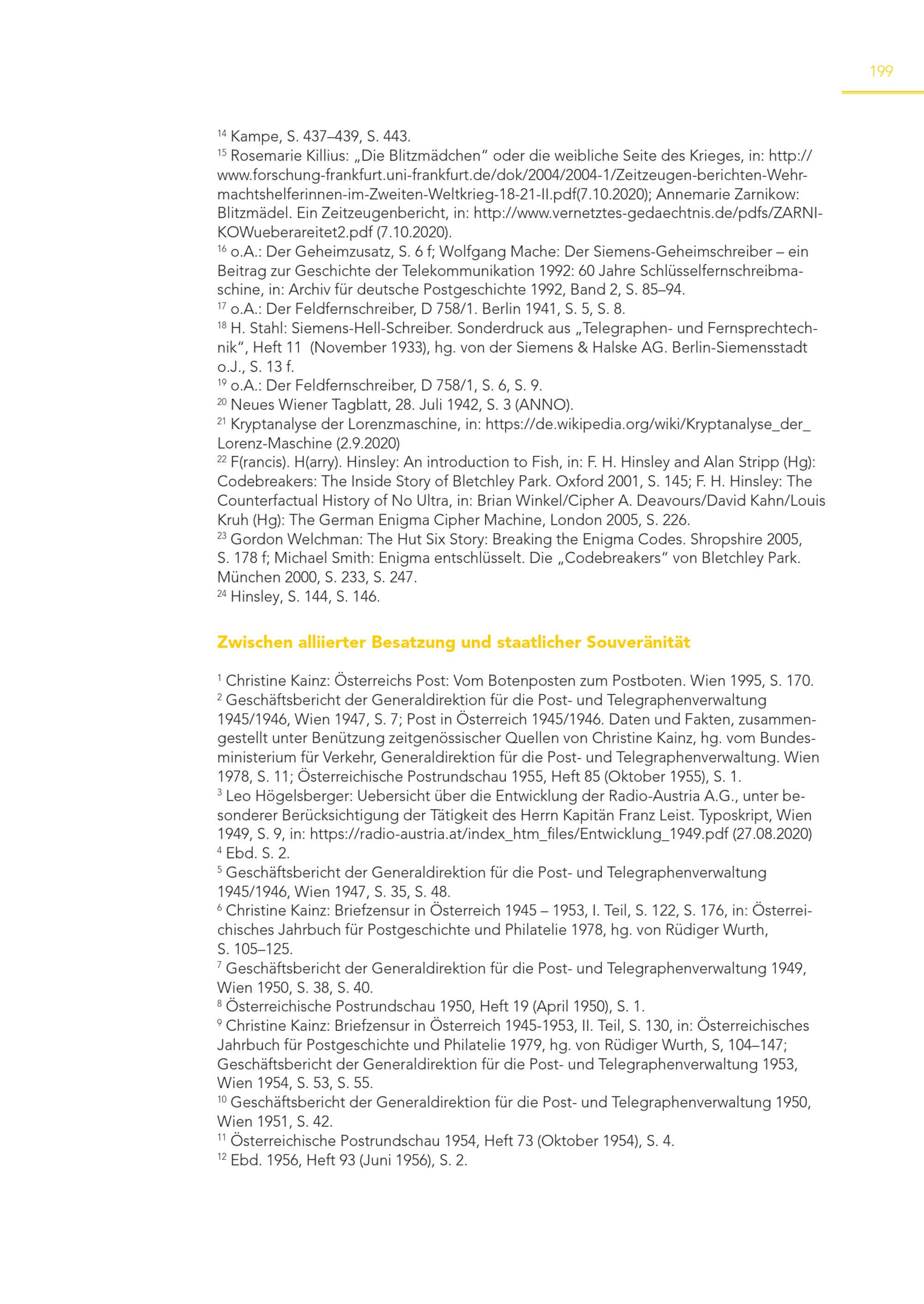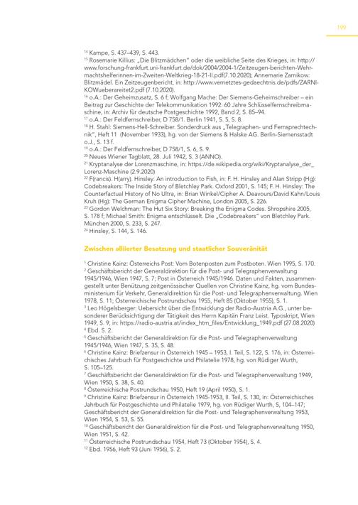 199 14 Kampe, S. 437–439, S. 443. 15 Rosemarie Killius:„Die Blitzmädchen“ oder die weibliche Seite des Krieges, in: http:// www.forschung-frankfurt.uni-frankfurt.de/dok/2004/2004-1/Zeitzeugen-berichten-Wehrmachtshelferinnen-im-Zweiten-Weltkrieg-18-21-II.pdf(7.10.2020); Annemarie Zarnikow: Blitzmädel. Ein Zeitzeugenbericht, in: http://www.vernetztes-gedaechtnis.de/pdfs/ZARNIKOWueberareitet2.pdf(7.10.2020). 16 o.A.: Der Geheimzusatz, S. 6 f; Wolfgang Mache: Der Siemens-Geheimschreiber – ein Beitrag zur Geschichte der Telekommunikation 1992: 60 Jahre Schlüsselfernschreibmaschine, in: Archiv für deutsche Postgeschichte 1992, Band 2, S. 85–94. 17 o.A.: Der Feldfernschreiber, D 758/1. Berlin 1941, S. 5, S. 8. 18 H. Stahl: Siemens-Hell-Schreiber. Sonderdruck aus„Telegraphen- und Fernsprechtechnik“, Heft 11(November 1933), hg. von der Siemens& Halske AG. Berlin-Siemensstadt o.J., S. 13 f. 19 o.A.: Der Feldfernschreiber, D 758/1, S. 6, S. 9. 20 Neues Wiener Tagblatt, 28. Juli 1942, S. 3(ANNO). 21 Kryptanalyse der Lorenzmaschine, in: https://de.wikipedia.org/wiki/Kryptanalyse_der_ Lorenz-Maschine(2.9.2020) 22 F(rancis). H(arry). Hinsley: An introduction to Fish, in: F. H. Hinsley and Alan Stripp(Hg): Codebreakers: The Inside Story of Bletchley Park. Oxford 2001, S. 145; F. H. Hinsley: The Counterfactual History of No Ultra, in: Brian Winkel/Cipher A. Deavours/David Kahn/Louis Kruh(Hg): The German Enigma Cipher Machine, London 2005, S. 226. 23 Gordon Welchman: The Hut Six Story: Breaking the Enigma Codes. Shropshire 2005, S. 178 f; Michael Smith: Enigma entschlüsselt. Die„Codebreakers“ von Bletchley Park. München 2000, S. 233, S. 247. 24 Hinsley, S. 144, S. 146. Zwischen alliierter Besatzung und staatlicher Souveränität 1 Christine Kainz: Österreichs Post: Vom Botenposten zum Postboten. Wien 1995, S. 170. 2 Geschäftsbericht der Generaldirektion für die Post- und Telegraphenverwaltung 1945/1946, Wien 1947, S. 7; Post in Österreich 1945/1946. Daten und Fakten, zusammengestellt unter Benützung zeitgenössischer Quellen von Christine Kainz, hg. vom Bundesministerium für Verkehr, Generaldirektion für die Post- und Telegraphenverwaltung. Wien 1978, S. 11; Österreichische Postrundschau 1955, Heft 85(Oktober 1955), S. 1. 3 Leo Högelsberger: Uebersicht über die Entwicklung der Radio-Austria A.G., unter besonderer Berücksichtigung der Tätigkeit des Herrn Kapitän Franz Leist. Typoskript, Wien 1949, S. 9, in: https://radio-austria.at/index_htm_files/Entwicklung_1949.pdf(27.08.2020) 4 Ebd. S. 2. 5 Geschäftsbericht der Generaldirektion für die Post- und Telegraphenverwaltung 1945/1946, Wien 1947, S. 35, S. 48. 6 Christine Kainz: Briefzensur in Österreich 1945 – 1953, I. Teil, S. 122, S. 176, in: Österreichisches Jahrbuch für Postgeschichte und Philatelie 1978, hg. von Rüdiger Wurth, S. 105–125. 7 Geschäftsbericht der Generaldirektion für die Post- und Telegraphenverwaltung 1949, Wien 1950, S. 38, S. 40. 8 Österreichische Postrundschau 1950, Heft 19(April 1950), S. 1. 9 Christine Kainz: Briefzensur in Österreich 1945-1953, II. Teil, S. 130, in: Österreichisches Jahrbuch für Postgeschichte und Philatelie 1979, hg. von Rüdiger Wurth, S, 104–147; Geschäftsbericht der Generaldirektion für die Post- und Telegraphenverwaltung 1953, Wien 1954, S. 53, S. 55. 10 Geschäftsbericht der Generaldirektion für die Post- und Telegraphenverwaltung 1950, Wien 1951, S. 42. 11 Österreichische Postrundschau 1954, Heft 73(Oktober 1954), S. 4. 12 Ebd. 1956, Heft 93(Juni 1956), S. 2.
