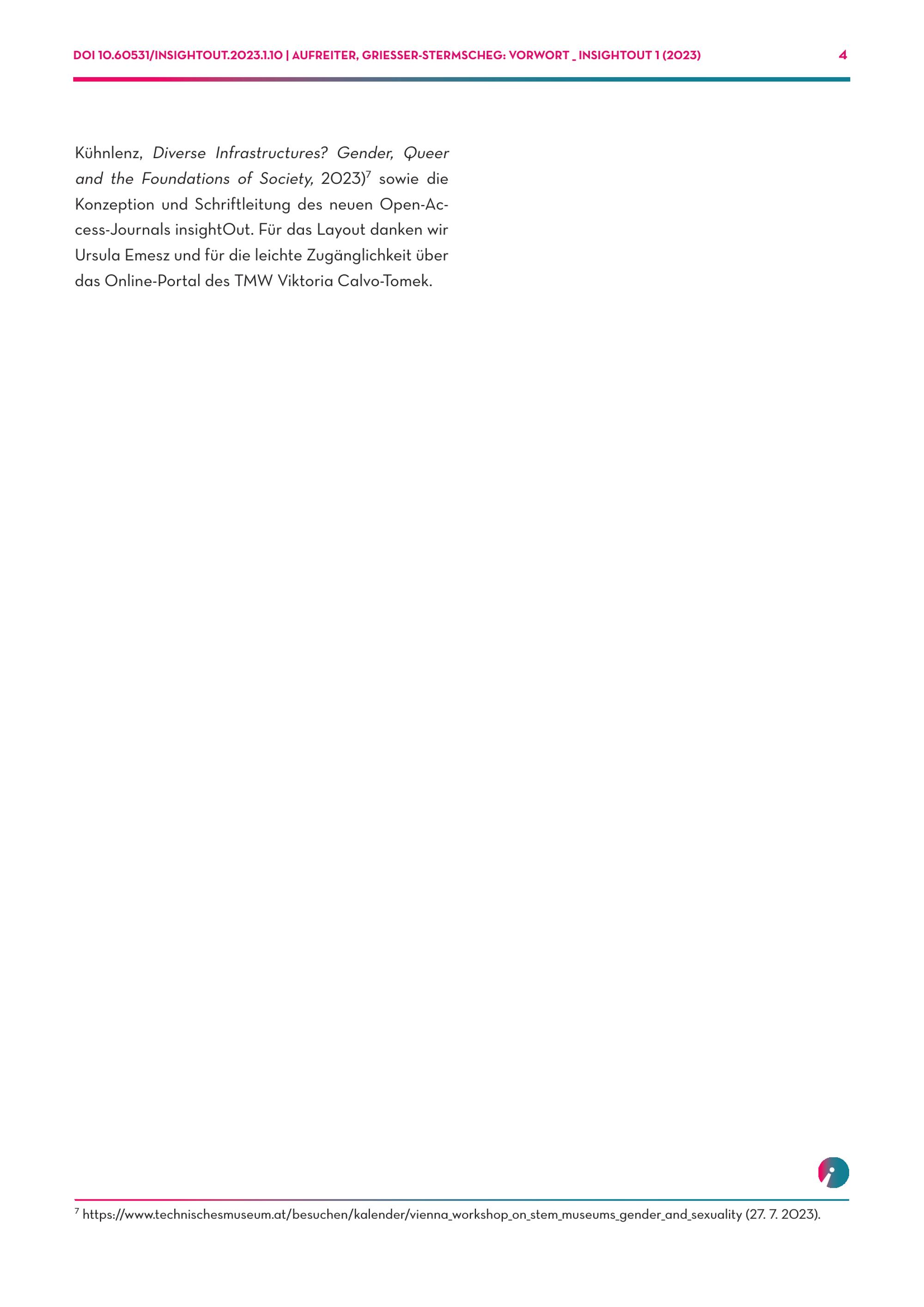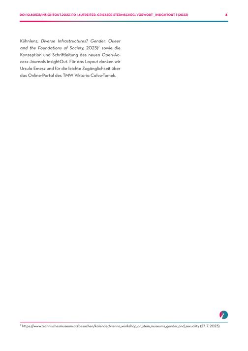 DOI 10.60531/INSIGHTOUT.2023.1.10| AUFREITER, GRIESSER-STERMSCHEG: VORWORT_ INSIGHTOUT 1(2023) 4 Kühnlenz, Diverse Infrastructures? Gender, Queer and the Foundations of Society, 2023) 7 sowie die Konzeption und Schriftleitung des neuen Open-Access-Journals insightOut. Für das Layout danken wir Ursula Emesz und für die leichte Zugänglichkeit über das Online-Portal des TMW Viktoria Calvo-Tomek. 7 https://www.technischesmuseum.at/besuchen/kalender/vienna_workshop_on_stem_museums_gender_and_sexuality(27. 7. 2023).