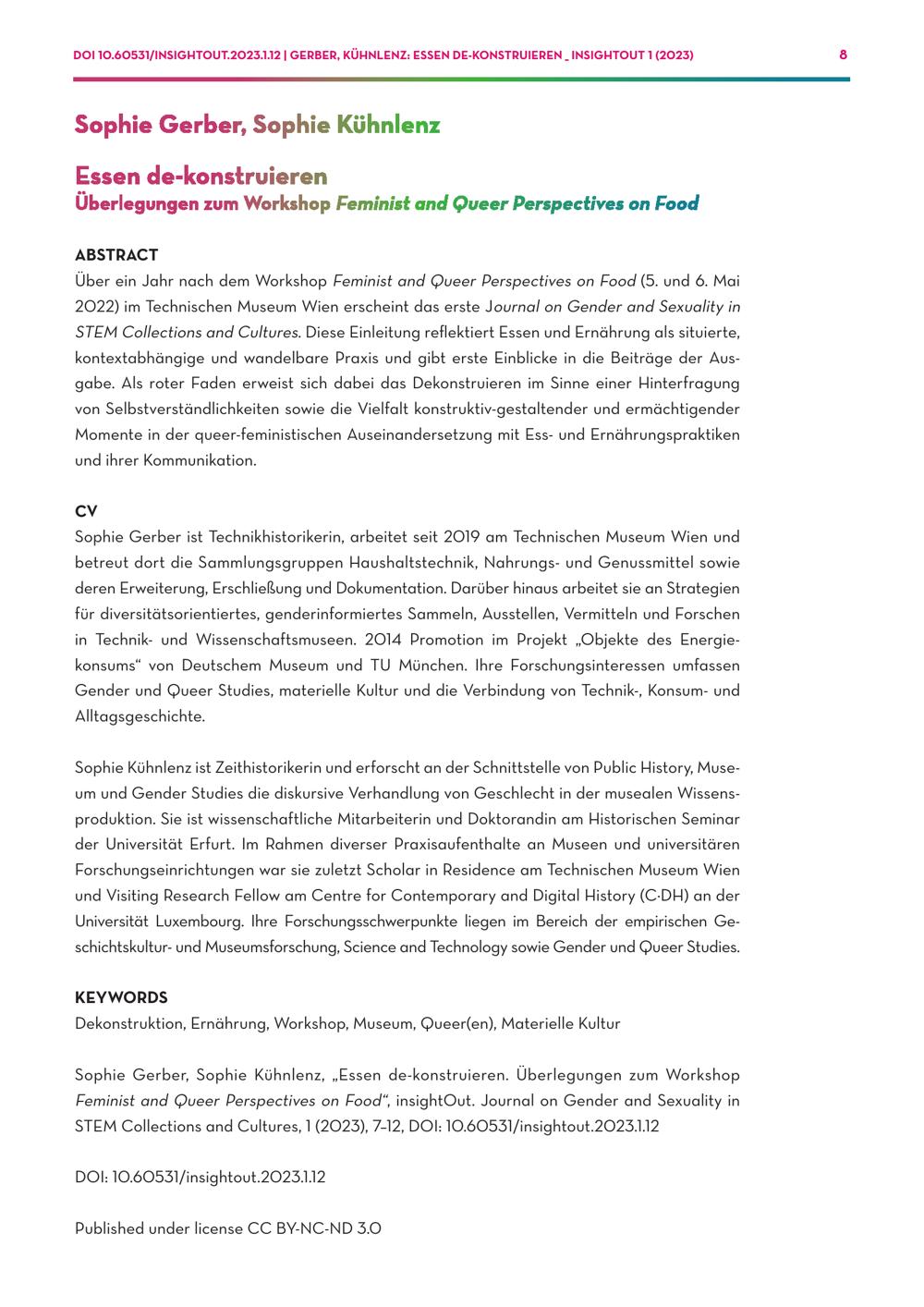 DOI 10.60531/INSIGHTOUT.2023.1.12| GERBER, KÜHNLENZ: ESSEN DE-KONSTRUIEREN_ INSIGHTOUT 1(2023) 8 Sophie Gerber, Sophie Kühnlenz Essen de-konstruieren Überlegungen zum Workshop Feminist and Queer Perspectives on Food ABSTRACT Über ein Jahr nach dem Workshop Feminist and Queer Perspectives on Food (5. und 6. Mai 2022) im Technischen Museum Wien erscheint das erste J ournal on Gender and Sexuality in STEM Collections and Cultures . Diese Einleitung reflektiert Essen und Ernährung als situierte, kontextabhängige und wandelbare Praxis und gibt erste Einblicke in die Beiträge der Ausgabe. Als roter Faden erweist sich dabei das Dekonstruieren im Sinne einer Hinterfragung von Selbstverständlichkeiten sowie die Vielfalt konstruktiv-gestaltender und ermächtigender Momente in der queer-feministischen Auseinandersetzung mit Ess- und Ernährungspraktiken und ihrer Kommunikation. CV Sophie Gerber ist Technikhistorikerin, arbeitet seit 2019 am Technischen Museum Wien und betreut dort die Sammlungsgruppen Haushaltstechnik, Nahrungs- und Genussmittel sowie deren Erweiterung, Erschließung und Dokumentation. Darüber hinaus arbeitet sie an Strategien für diversitätsorientiertes, genderinformiertes Sammeln, Ausstellen, Vermitteln und Forschen in Technik- und Wissenschaftsmuseen. 2014 Promotion im Projekt„Objekte des Energiekonsums“ von Deutschem Museum und TU München. Ihre Forschungsinteressen umfassen Gender und Queer Studies, materielle Kultur und die Verbindung von Technik-, Konsum- und Alltagsgeschichte. Sophie Kühnlenz ist Zeithistorikerin und erforscht an der Schnittstelle von Public History, Museum und Gender Studies die diskursive Verhandlung von Geschlecht in der musealen Wissensproduktion. Sie ist wissenschaftliche Mitarbeiterin und Doktorandin am Historischen Seminar der Universität Erfurt. Im Rahmen diverser Praxisaufenthalte an Museen und universitären Forschungseinrichtungen war sie zuletzt Scholar in Residence am Technischen Museum Wien und Visiting Research Fellow am Centre for Contemporary and Digital History(C²DH) an der Universität Luxembourg. Ihre Forschungsschwerpunkte liegen im Bereich der empirischen Geschichtskultur- und Museumsforschung, Science and Technology sowie Gender und Queer Studies. KEYWORDS Dekonstruktion, Ernährung, Workshop, Museum, Queer(en), Materielle Kultur Sophie Gerber, Sophie Kühnlenz,„Essen de-konstruieren. Überlegungen zum Workshop Feminist and Queer Perspectives on Food“ , insightOut. Journal on Gender and Sexuality in STEM Collections and Cultures, 1(2023), 7–12, DOI: 10.60531/insightout.2023.1.12 DOI: 10.60531/insightout.2023.1.12 Published under license CC BY-NC-ND 3.0