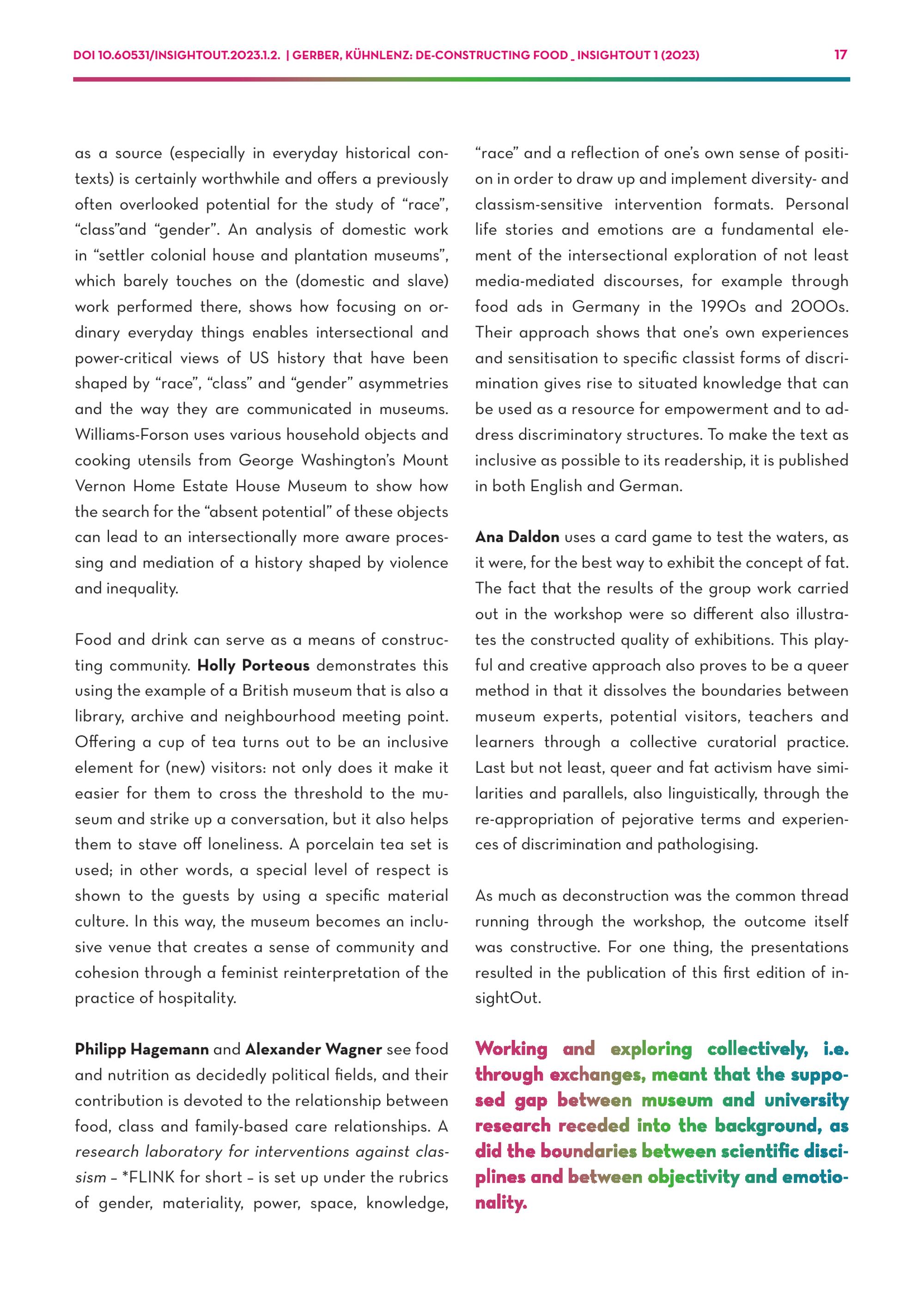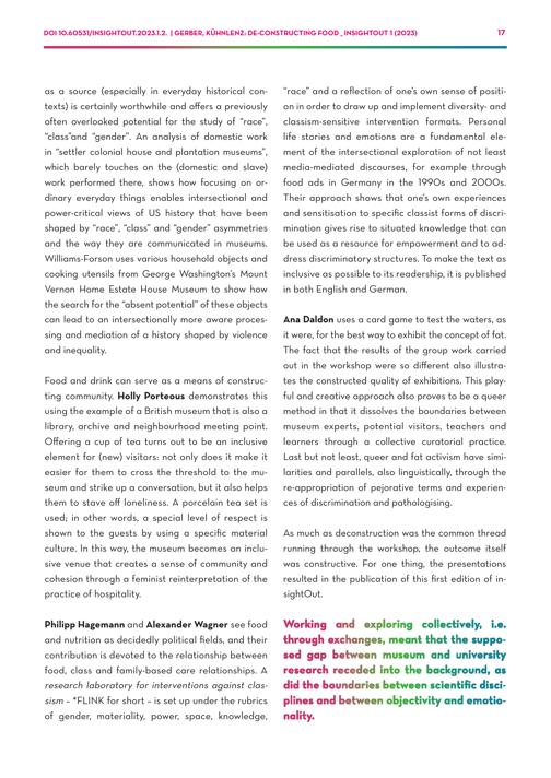 DOI 10.60531/INSIGHTOUT.2023.1.2.| GERBER, KÜHNLENZ: DE-CONSTRUCTING FOOD_ INSIGHTOUT 1(2023) 17 as a source(especially in everyday historical contexts) is certainly worthwhile and offers a previously often overlooked potential for the study of“race”, “class”and“gender”. An analysis of domestic work in“settler colonial house and plantation museums”, which barely touches on the(domestic and slave) work performed there, shows how focusing on ordinary everyday things enables intersectional and power-critical views of US history that have been shaped by“race”,“class” and“gender” asymmetries and the way they are communicated in museums. Williams-Forson uses various household objects and cooking utensils from George Washington’s Mount Vernon Home Estate House Museum to show how the search for the“absent potential” of these objects can lead to an intersectionally more aware processing and mediation of a history shaped by violence and inequality. Food and drink can serve as a means of constructing community. Holly Porteous demonstrates this using the example of a British museum that is also a library, archive and neighbourhood meeting point. Offering a cup of tea turns out to be an inclusive element for(new) visitors: not only does it make it easier for them to cross the threshold to the museum and strike up a conversation, but it also helps them to stave off loneliness. A porcelain tea set is used; in other words, a special level of respect is shown to the guests by using a specific material culture. In this way, the museum becomes an inclusive venue that creates a sense of community and cohesion through a feminist reinterpretation of the practice of hospitality. “race” and a reflection of one’s own sense of position in order to draw up and implement diversity- and classism-sensitive intervention formats. Personal life stories and emotions are a fundamental element of the intersectional exploration of not least media-mediated discourses, for example through food ads in Germany in the 1990s and 2000s. Their approach shows that one’s own experiences and sensitisation to specific classist forms of discrimination gives rise to situated knowledge that can be used as a resource for empowerment and to address discriminatory structures. To make the text as inclusive as possible to its readership, it is published in both English and German. Ana Daldon uses a card game to test the waters, as it were, for the best way to exhibit the concept of fat. The fact that the results of the group work carried out in the workshop were so different also illustrates the constructed quality of exhibitions. This playful and creative approach also proves to be a queer method in that it dissolves the boundaries between museum experts, potential visitors, teachers and learners through a collective curatorial practice. Last but not least, queer and fat activism have similarities and parallels, also linguistically, through the re-appropriation of pejorative terms and experiences of discrimination and pathologising. As much as deconstruction was the common thread running through the workshop, the outcome itself was constructive. For one thing, the presentations resulted in the publication of this first edition of insightOut. Philipp Hagemann and Alexander Wagner see food and nutrition as decidedly political fields, and their contribution is devoted to the relationship between food, class and family-based care relationships. A research laboratory for interventions against classism –*FLINK for short – is set up under the rubrics of gender, materiality, power, space, knowledge, Working and exploring collectively, i.e. through exchanges, meant that the supposed gap between museum and university research receded into the background, as did the boundaries between scientific disciplines and between objectivity and emotionality.